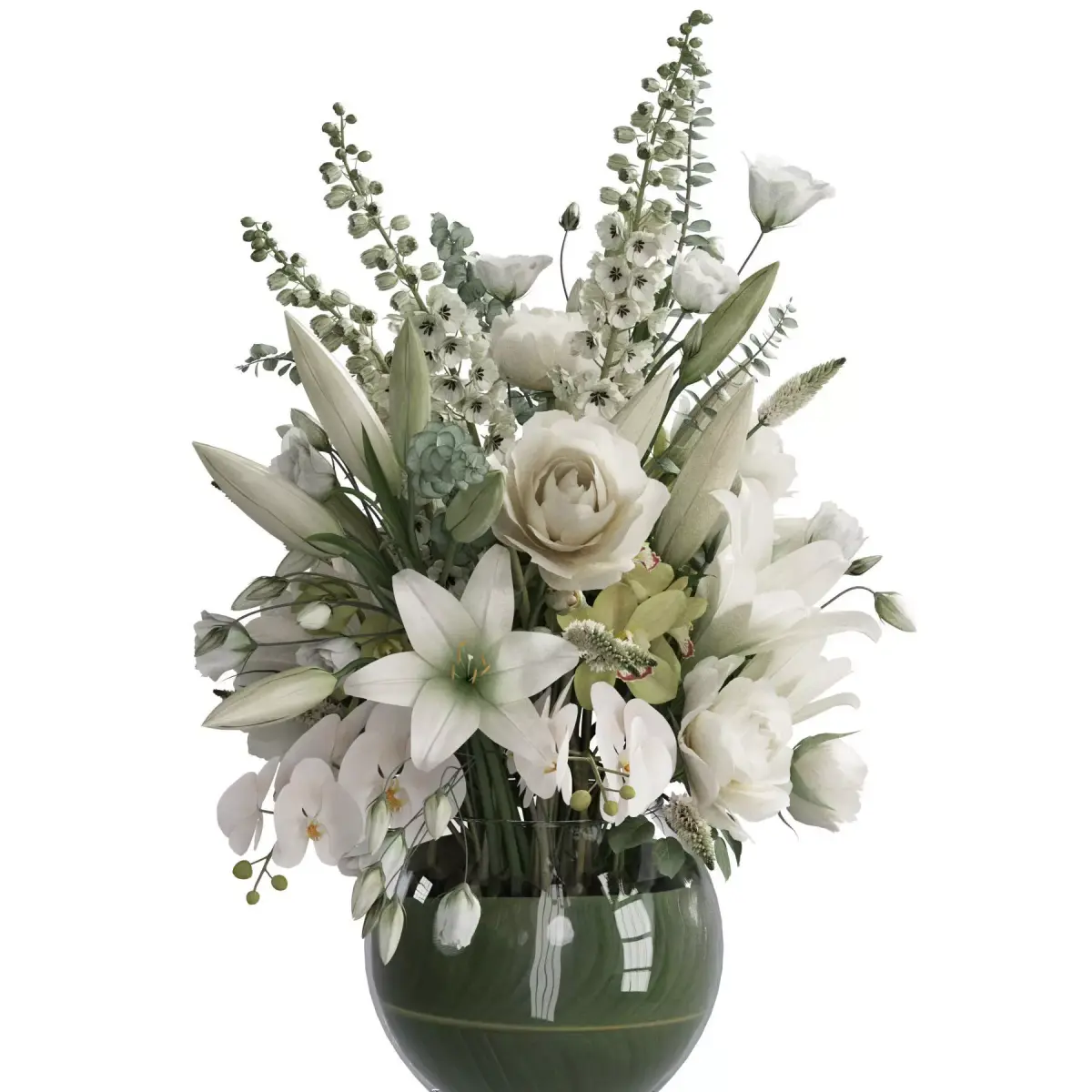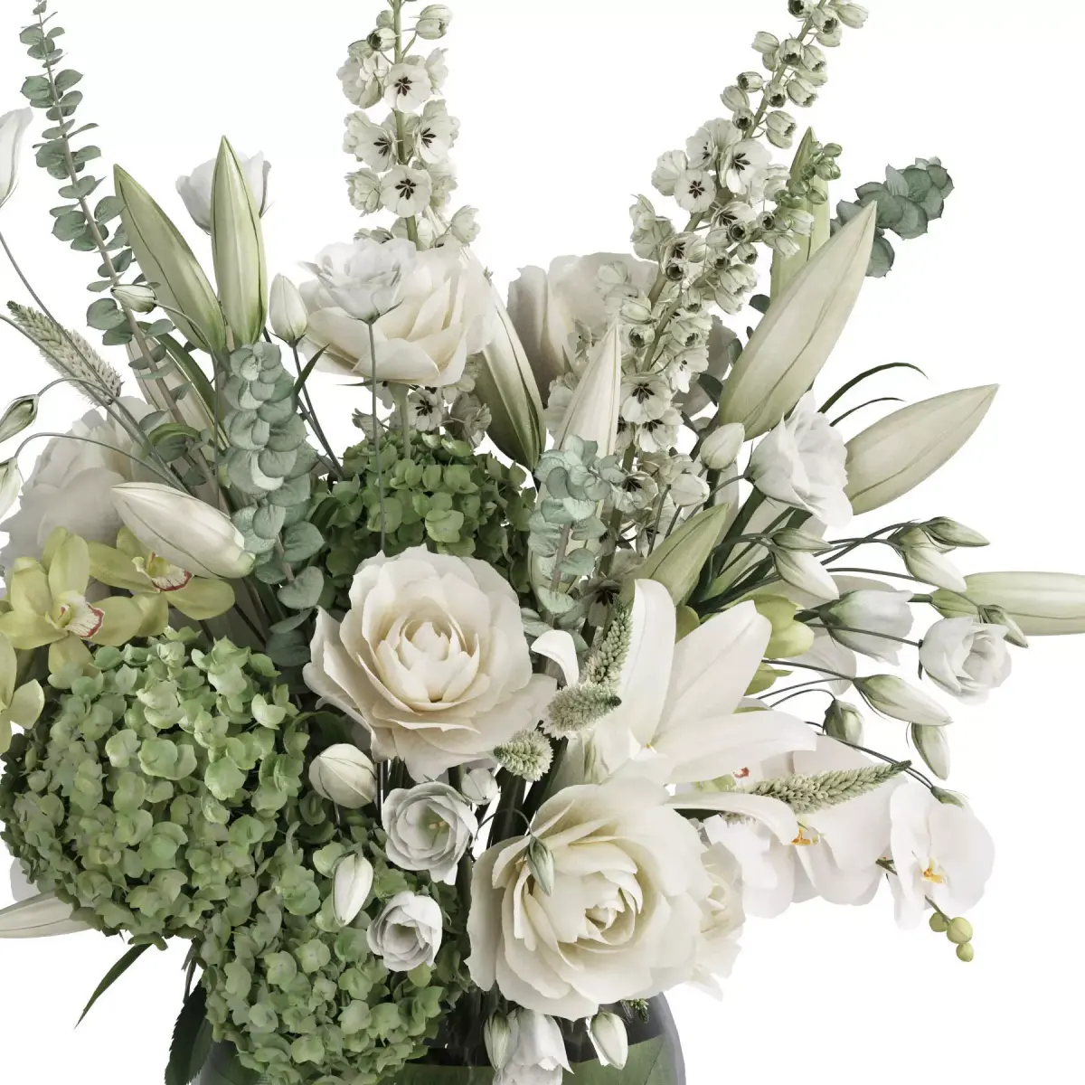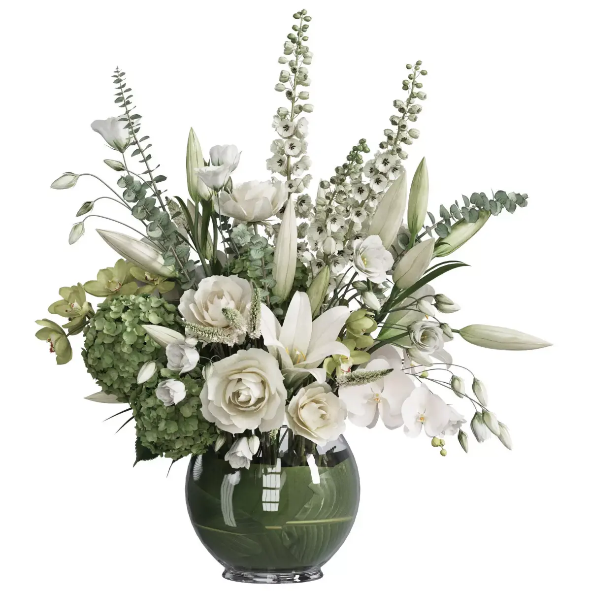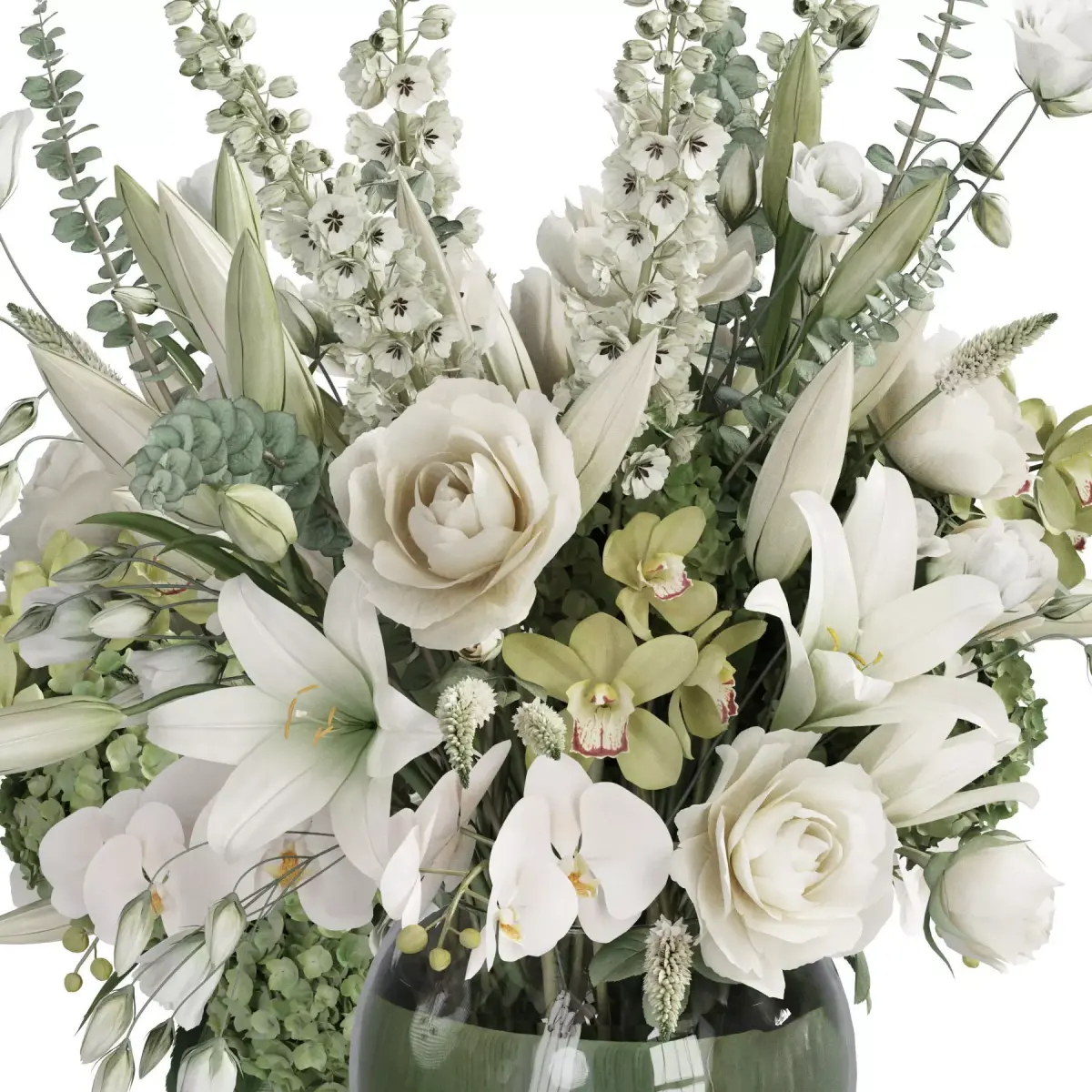 bouquet, plant, flower, flowers, indoor, decor, decorative, organic, vase, interior, decoration, flora, cymbidium orchid, delphinium, hydranegea, lilium, lisianthus, orchid, rose, veronica, glass,