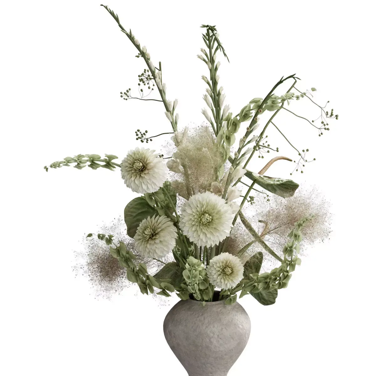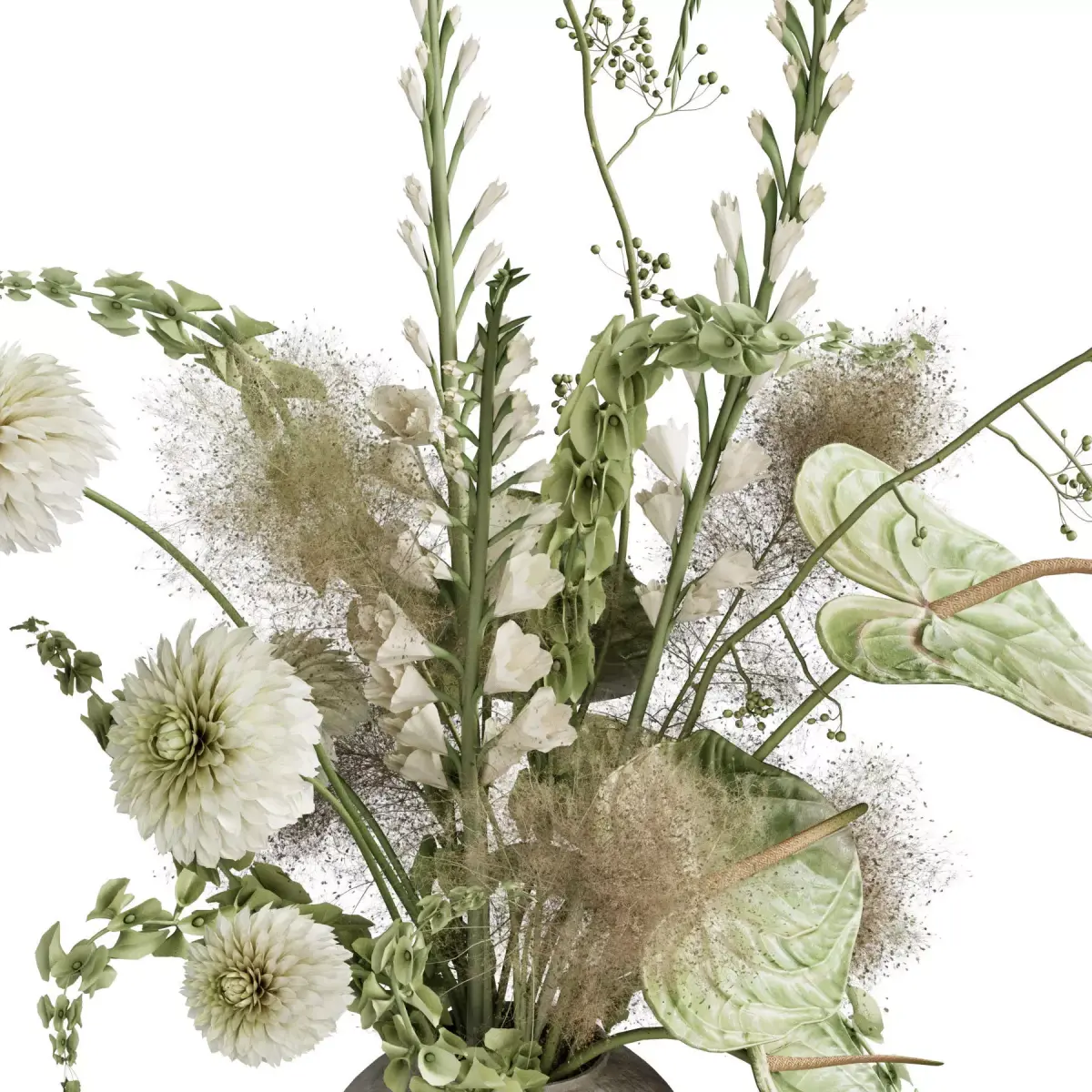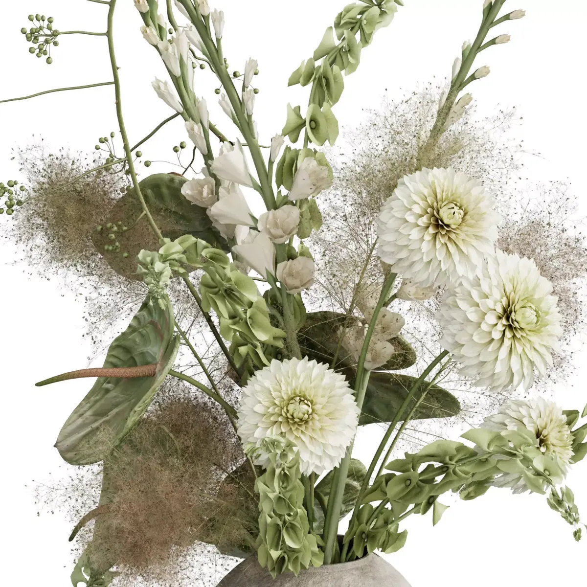 bouquet, plant, flower, flowers, indoor, decor, decorative, organic, vase, interior, decoration, flora, anthurium, bells of ireland, dahlia, gladiolus, rosehip, smoke bush,