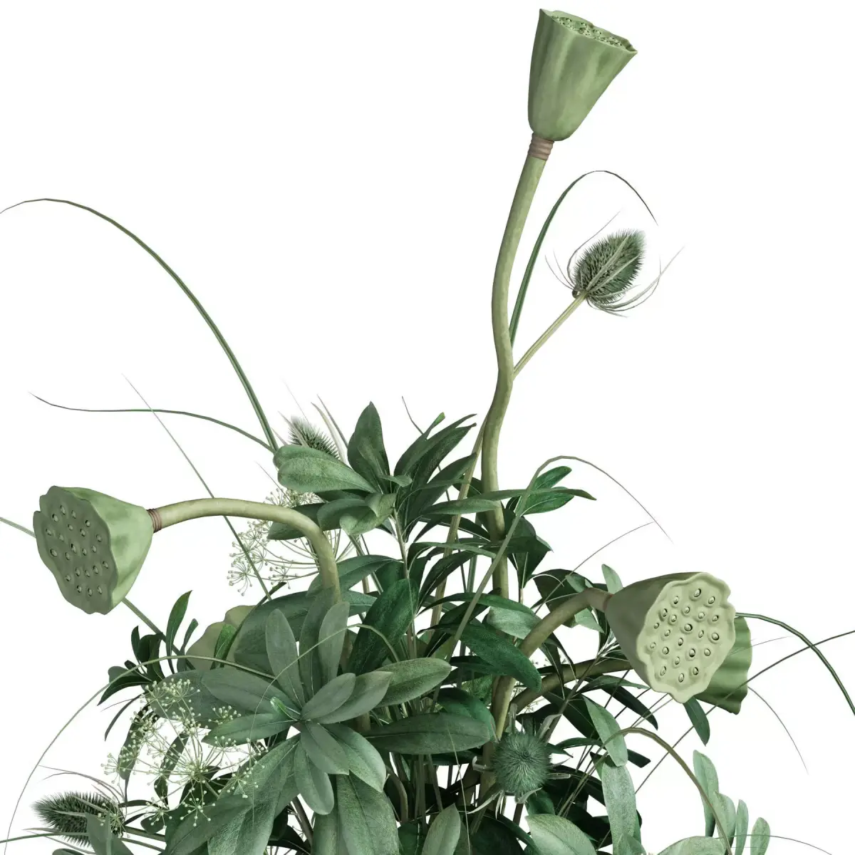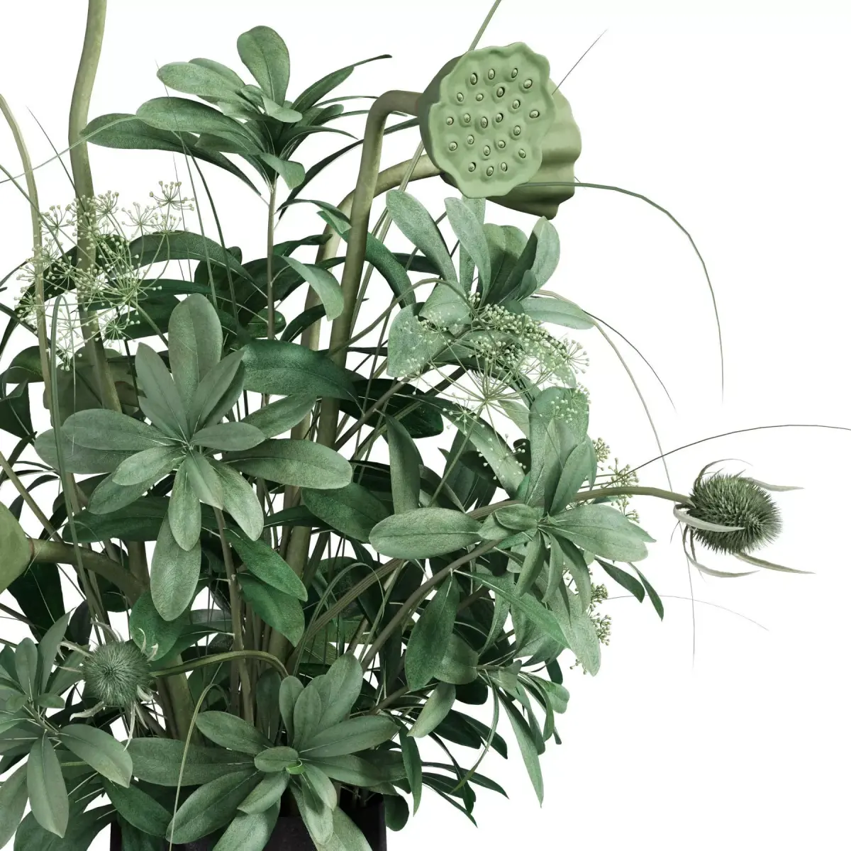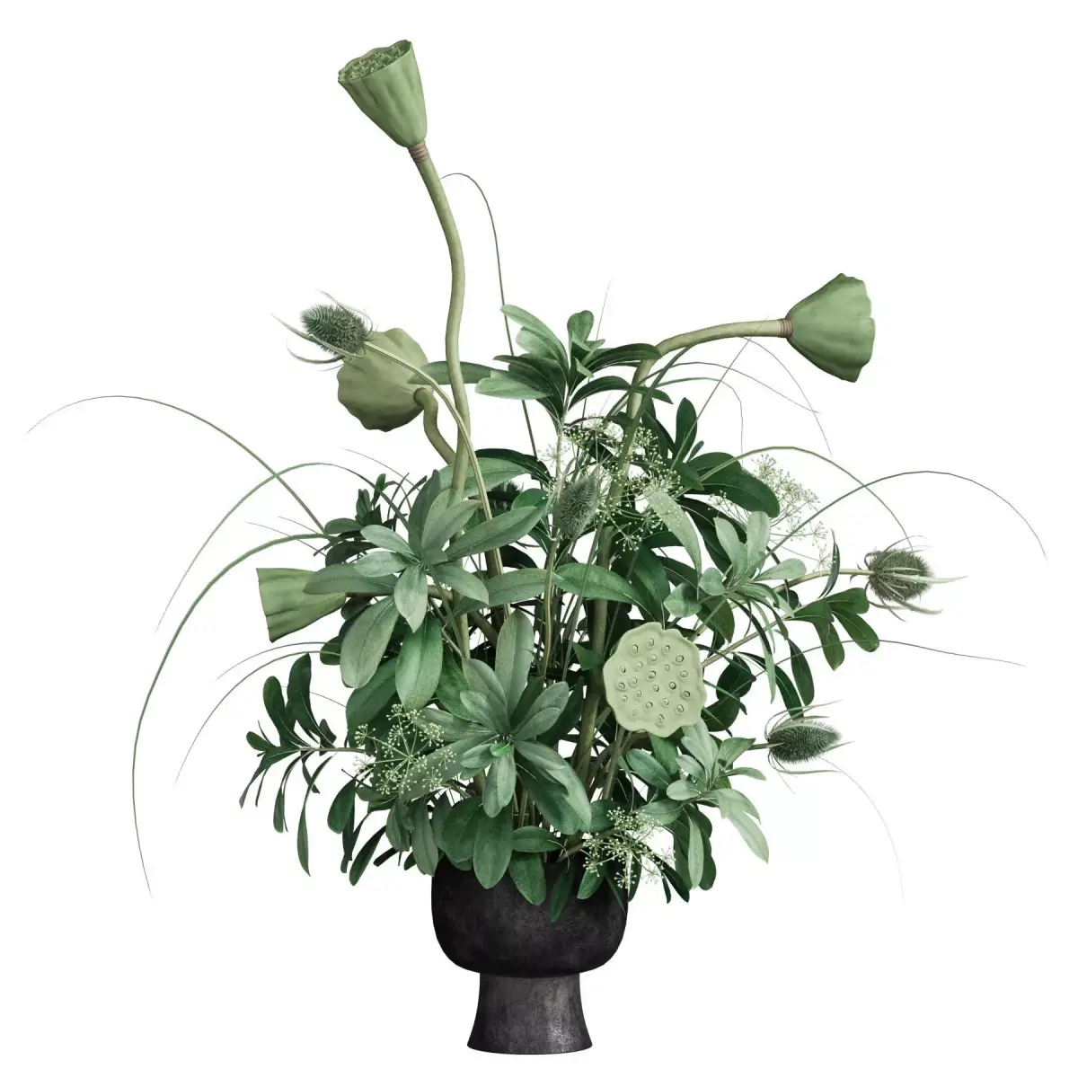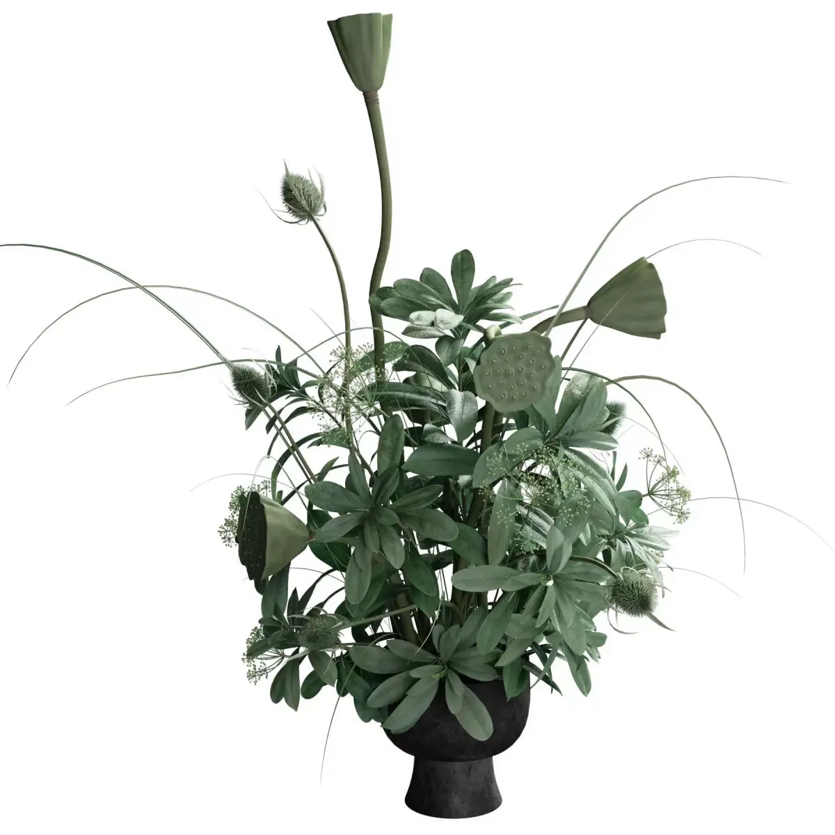 bouquet, plant, flower, flowers, indoor, decor, decorative, organic, vase, interior, decoration, flora, lotus, teasel, tobira, black, green,