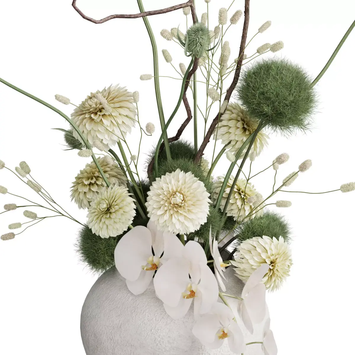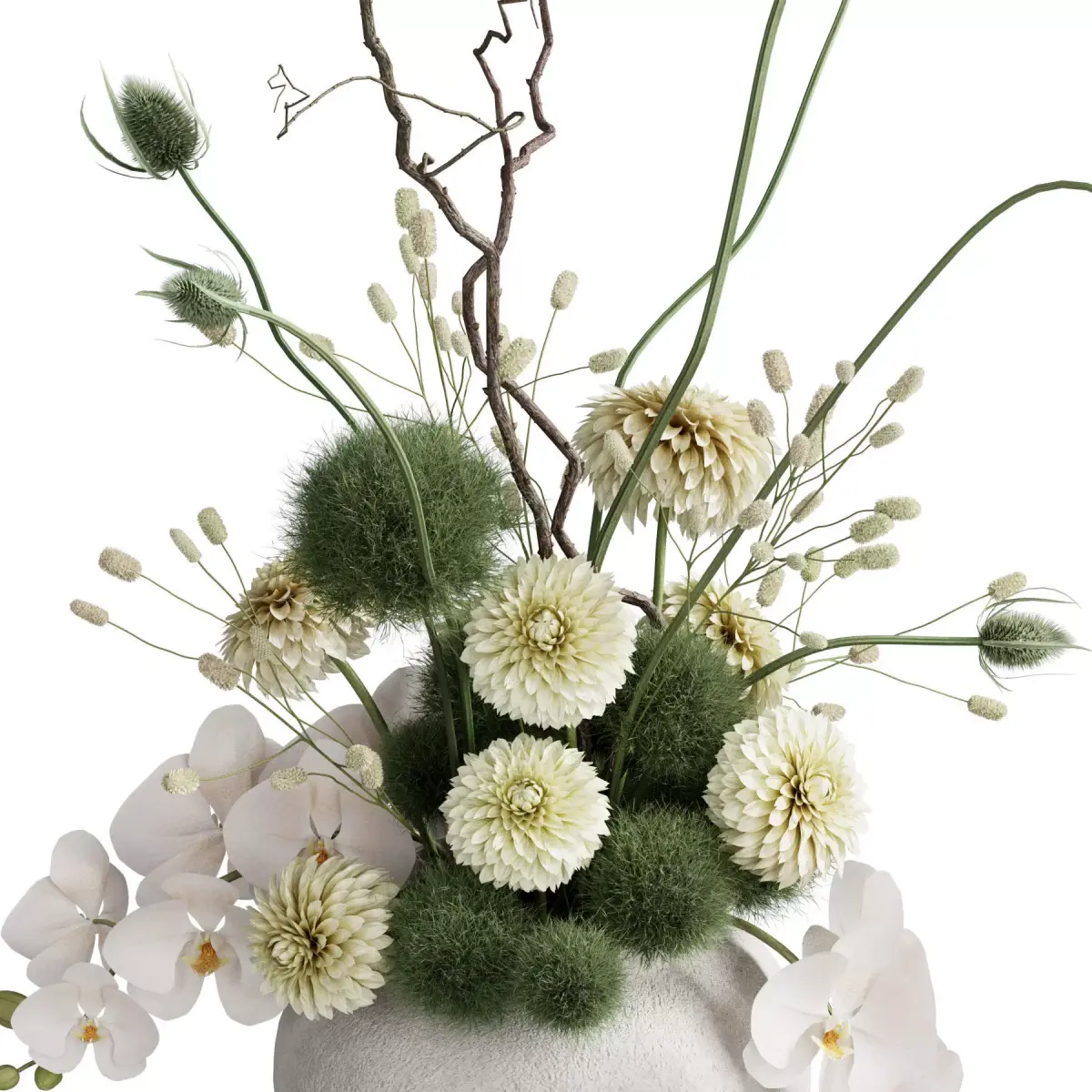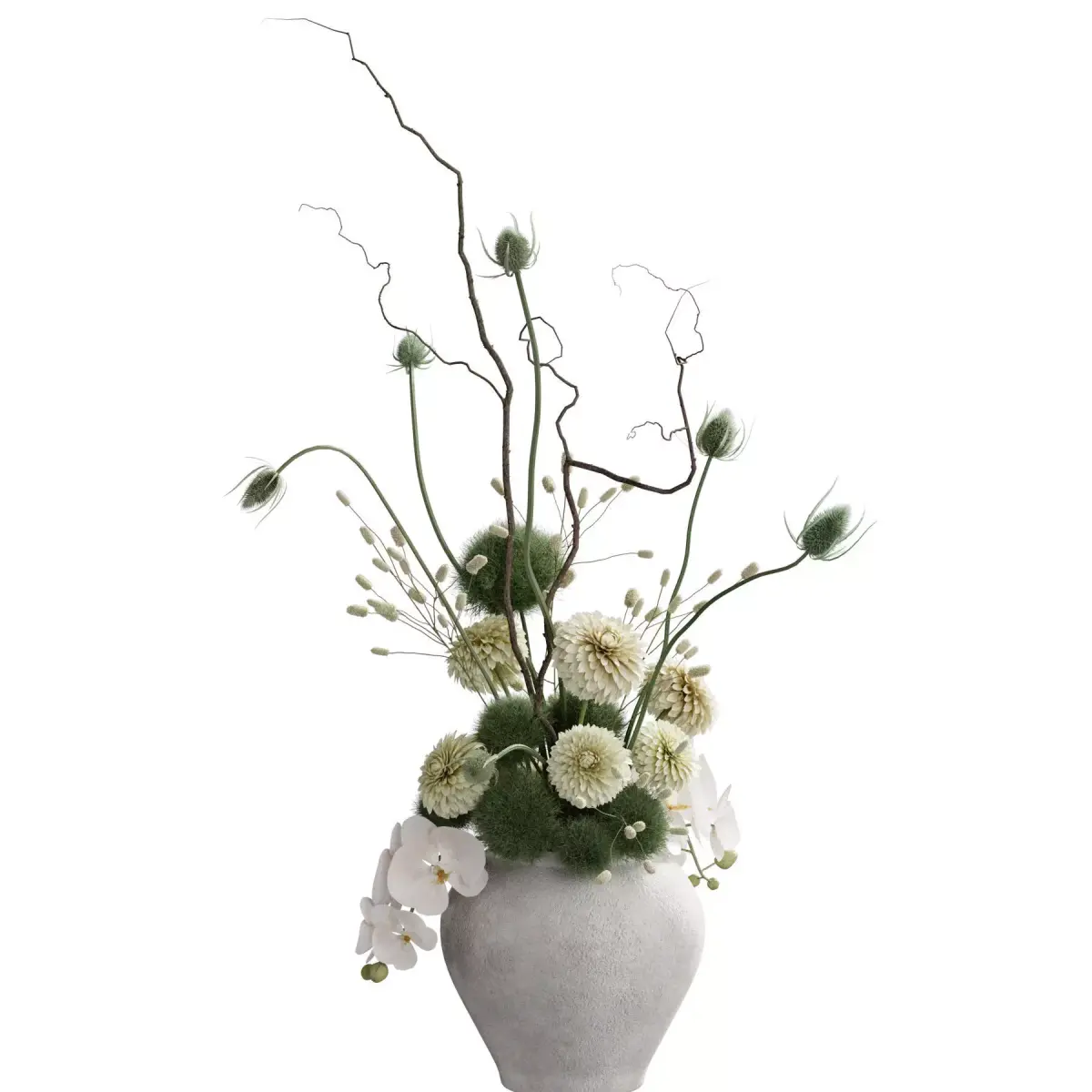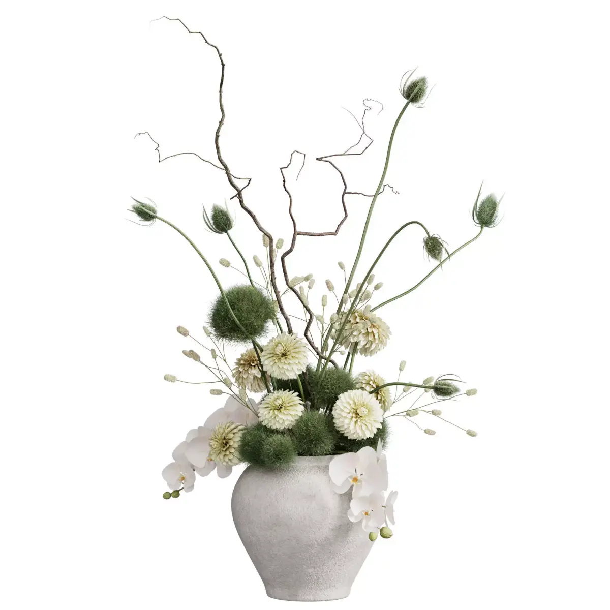 bouquet, plant, flower, flowers, indoor, decor, decorative, organic, vase, interior, decoration, flora, dahlia, greenball, orchid, sanguisorba, teasel, willow, green, white,
