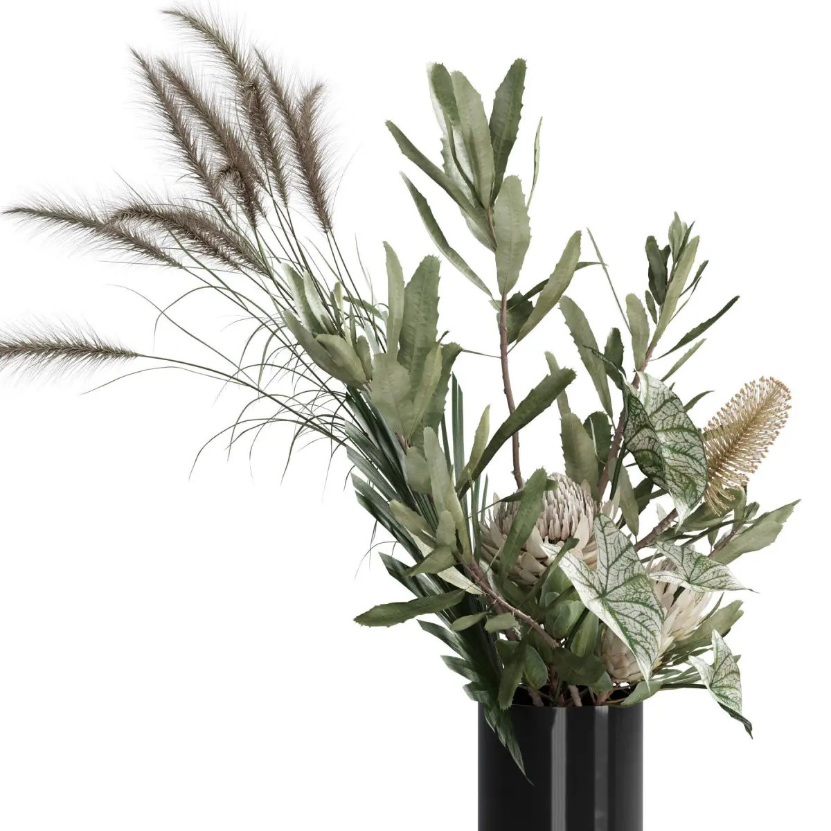 bouquet, plant, flower, flowers, indoor, decor, decorative, organic, vase, banksia, caladium, palm, grass, protea, flora, decoration, interior,