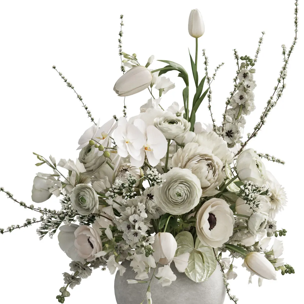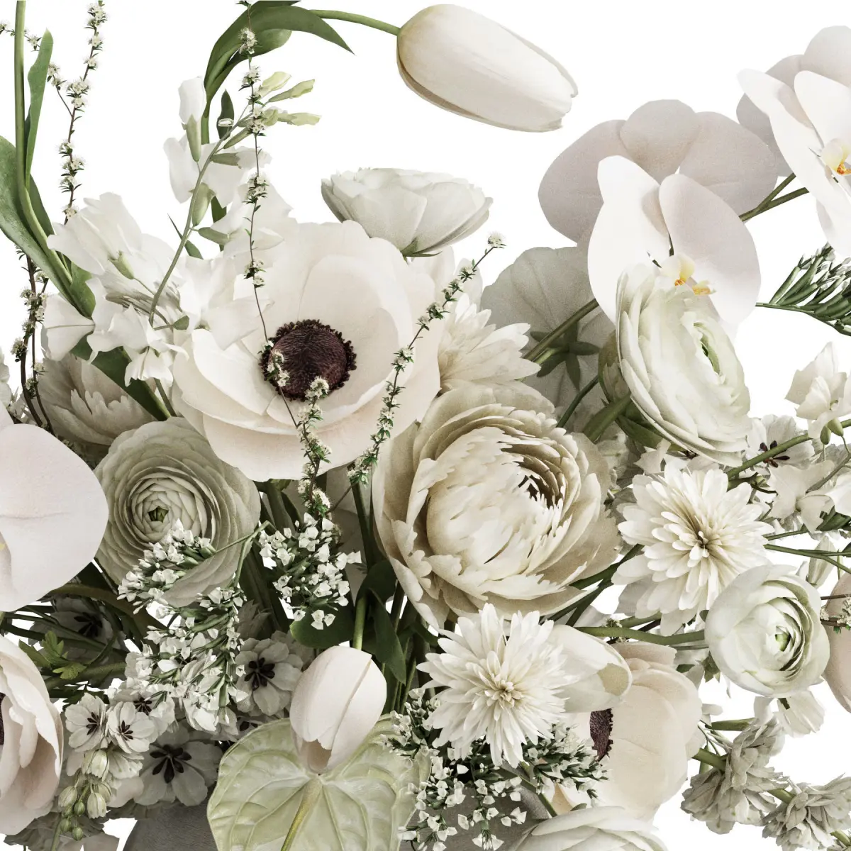 bouquet, plant, flower, flowers, indoor, decor, decorative, organic, vase, anthurium, anemone, dahlia, delphinium, orchid, peony, ranunculus, spiraea, statice, sweet pea, tulips, white, green,