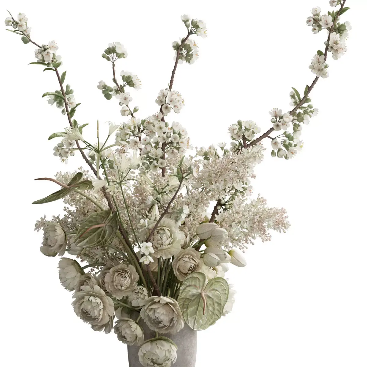 bouquet, plant, flower, flowers, indoor, decor, decorative, organic, vase, cherry, bloom, lilac, nerine, peony, tulips, anthurium, green, white, ceramice, clay, stone, inrerior, decoration, flora,
