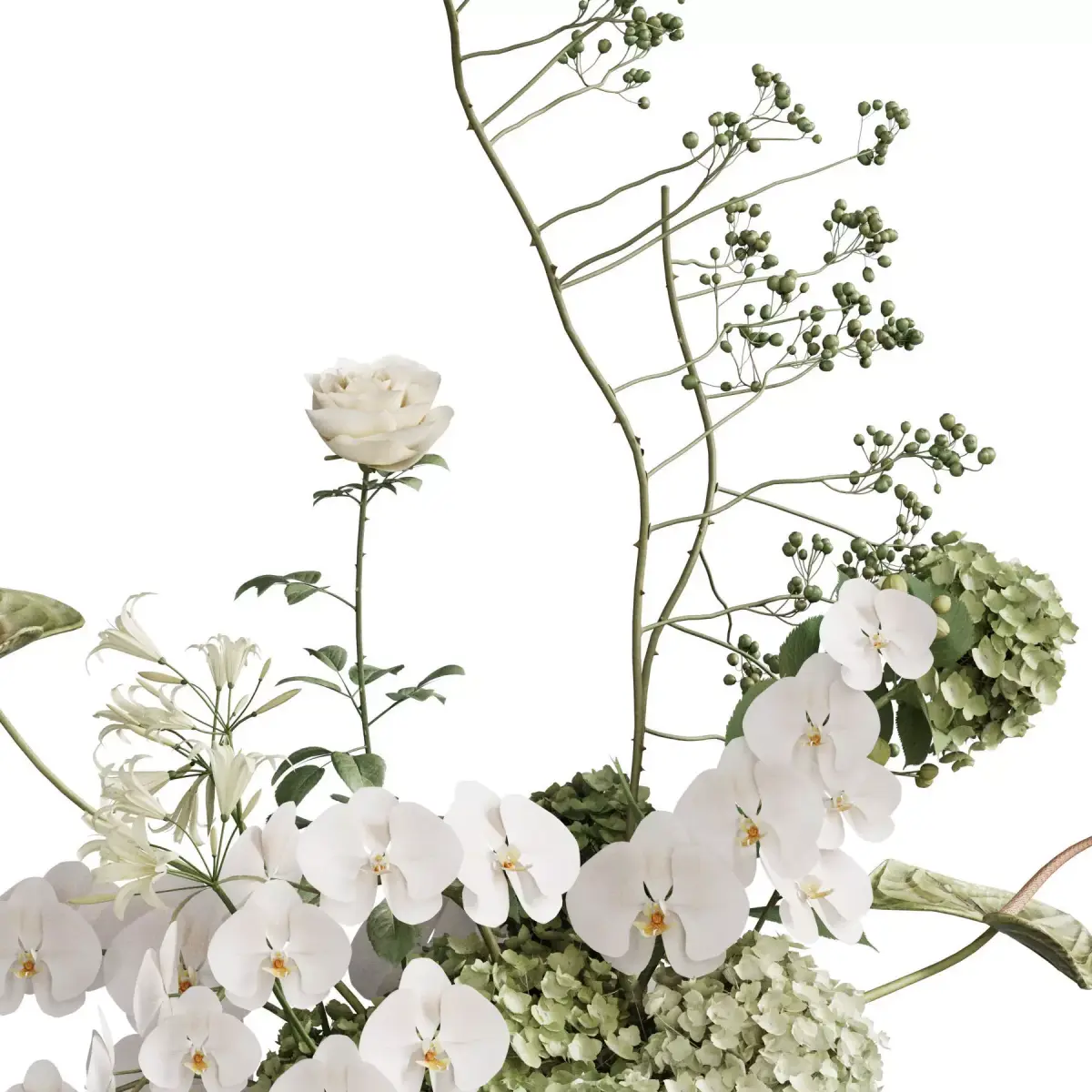 bouquet, plant, flower, flowers, indoor, decor, decorative, organic, vase, hydranegea, orchid, rose, rosehip, nerine, anthurium, green, white, ceramice, clay, stone, interior, decoration, flora,