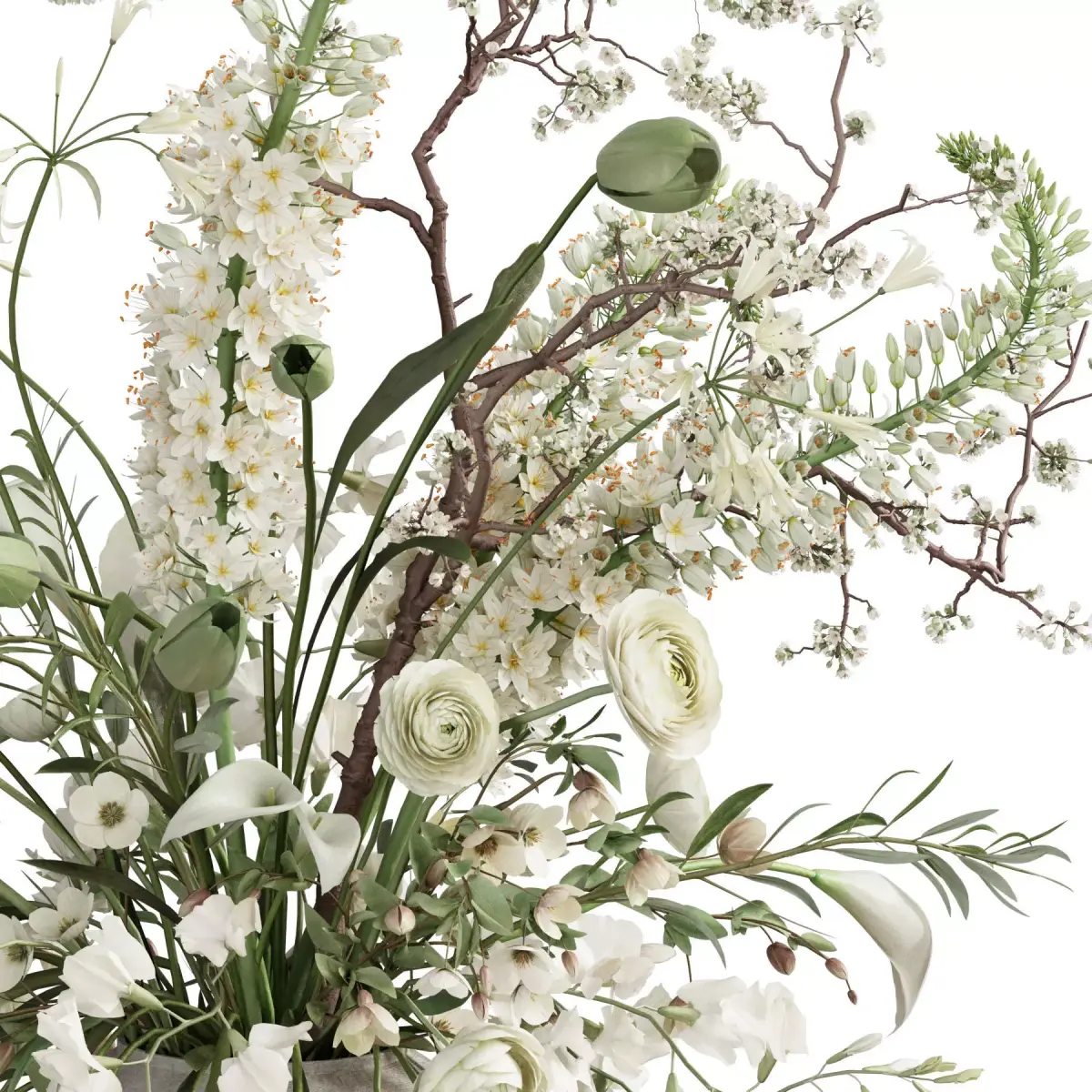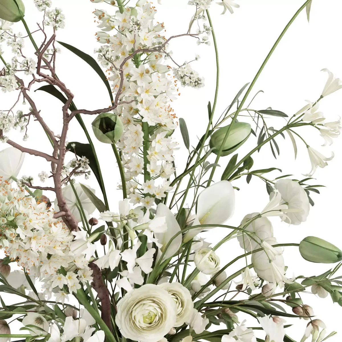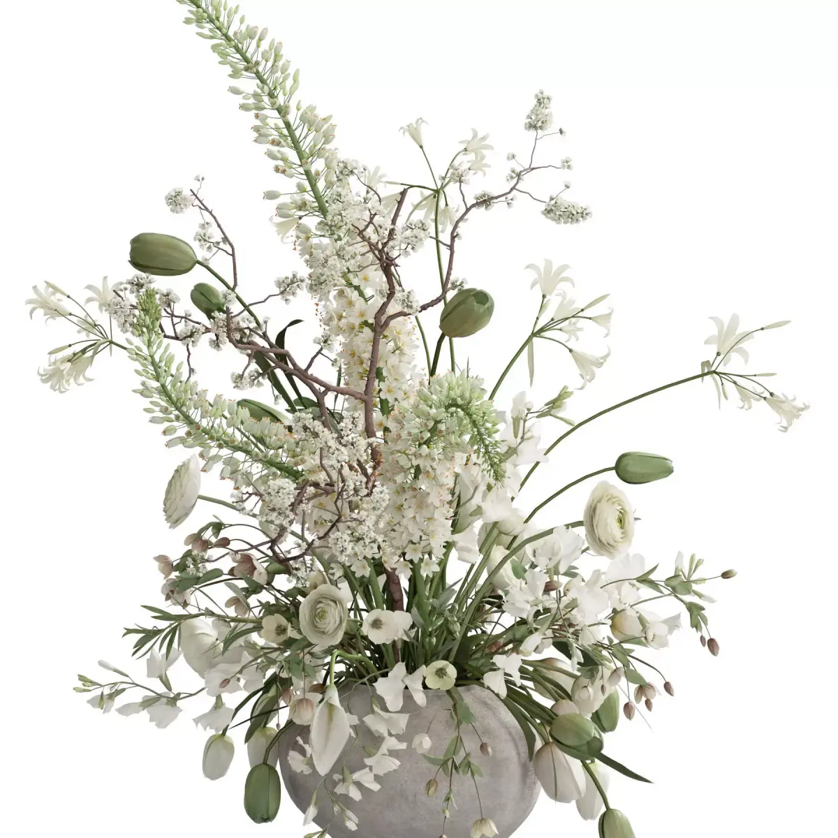 bouquet, plant, flower, flowers, indoor, decor, decorative, organic, vase, callalily, tulips, bloom, eremurus, eucalyptus, helleborus, nerine, ranunculus, sweetpeas, green, white, ceramice, clay, stone, interior, decoration, flora,