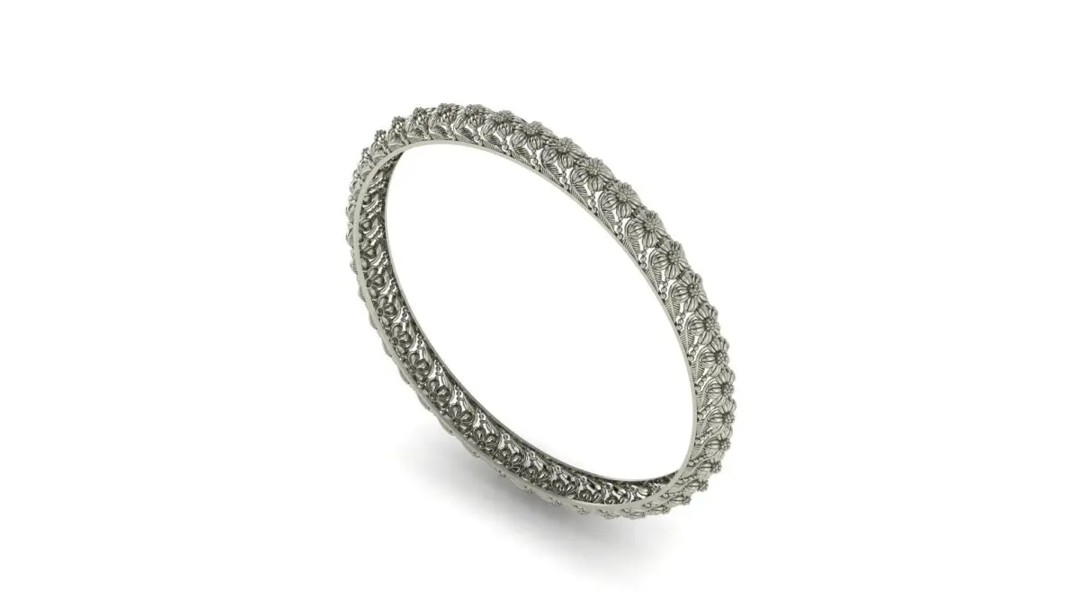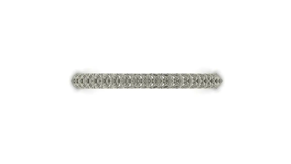 The design showcases a seamless row of delicately carved blossoms and leaf motifs, each petal and vein rendered in remarkable detail. The outer rim is adorned with a scalloped floral border, giving the piece a distinct silhouette and enhancing its ornamental appeal. The intricate filigree work not only adds depth and dimension but also reflects the light beautifully, creating a subtle sparkle with every movement.