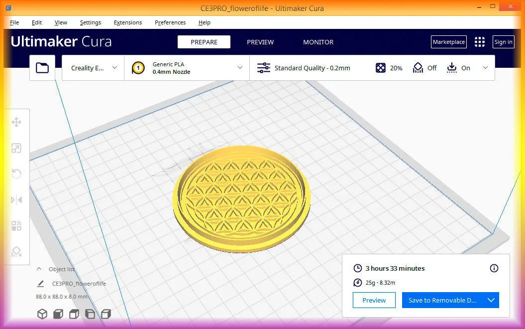 Dimensions: 88(x) * 88(y) * 8(z) mm. Formats included: stl, 3mf (Cura slicer settings of my Creality Ender-3 Pro 3d printer)