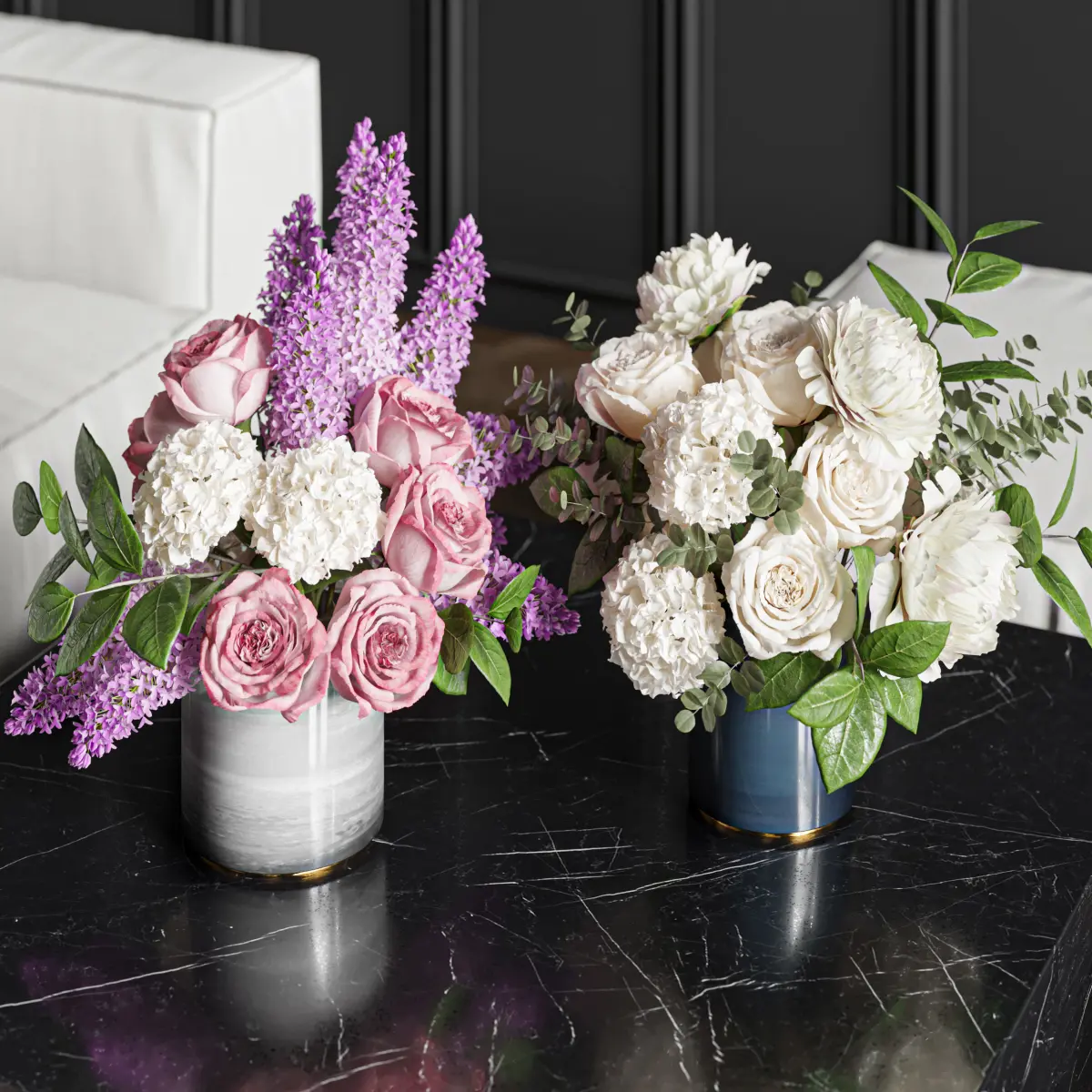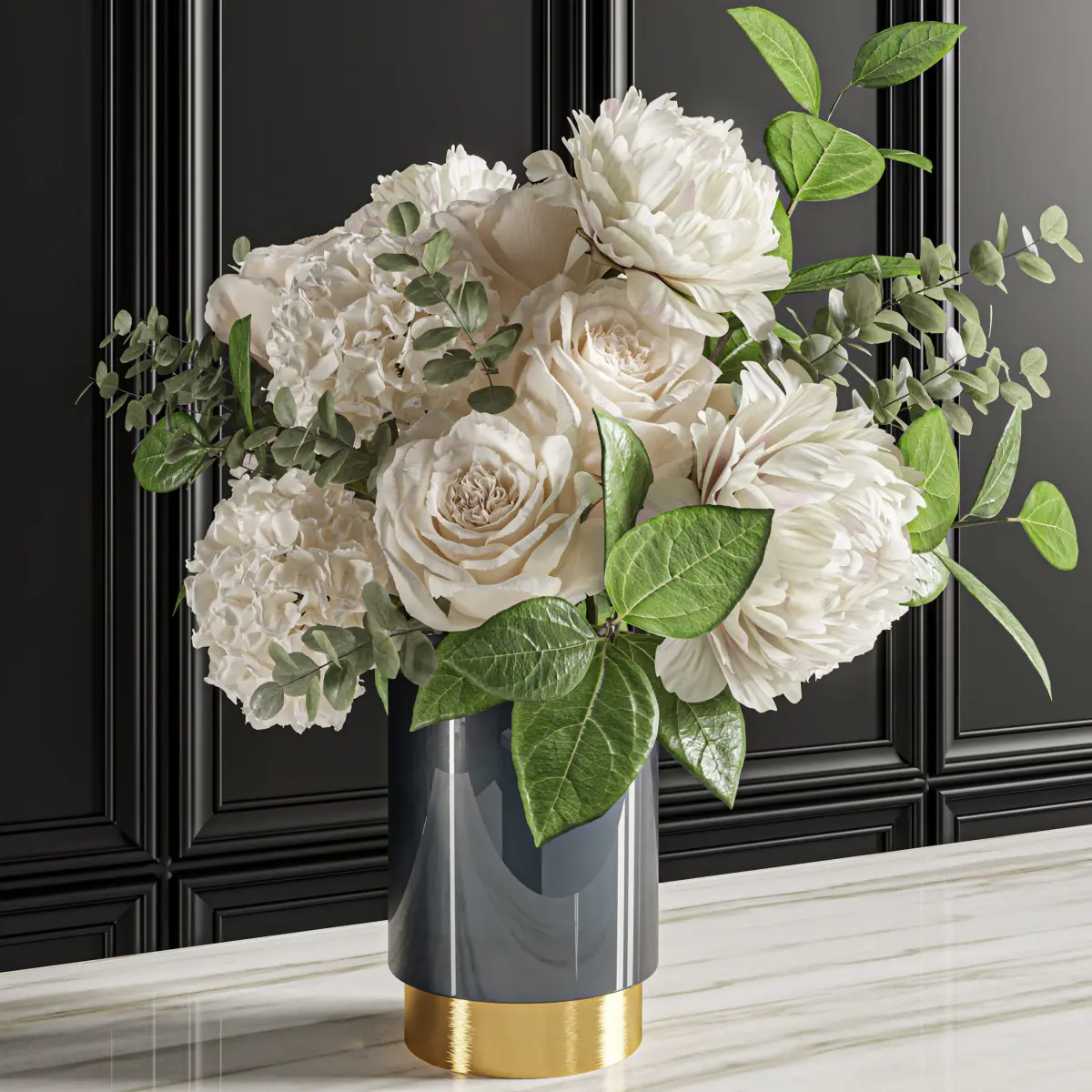 flower, vase, leaf, decor, decoration, white, rose, eucalyptus, lilac, pink, hydrangea, ceramic, gold, brushed,