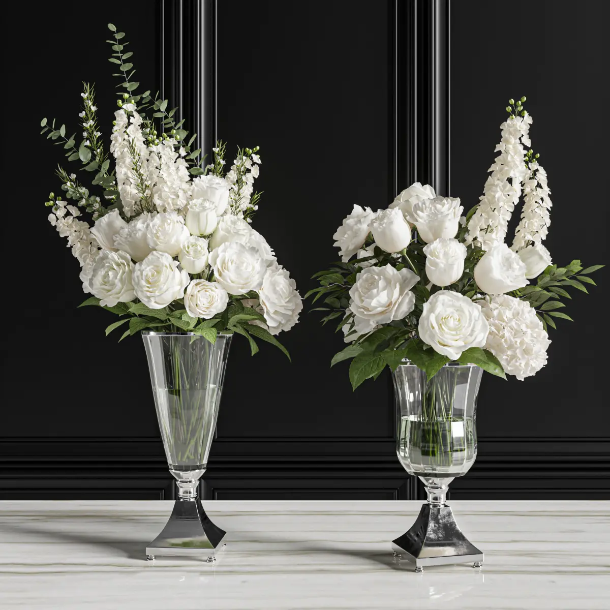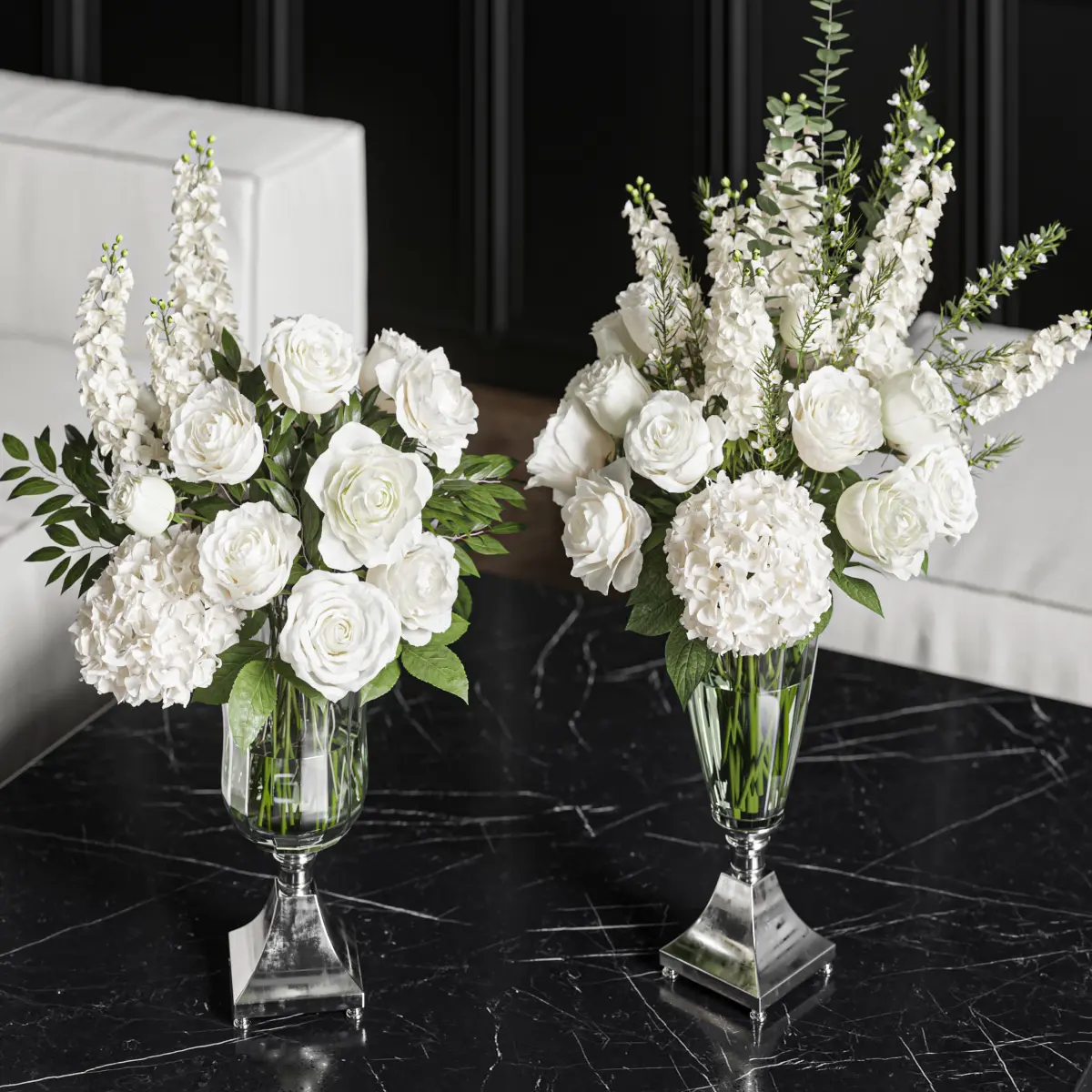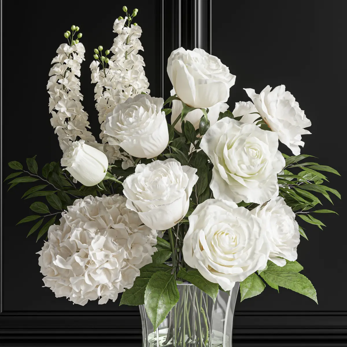 flower, vase, leaf, decor, decoration, set, rose, bouquet, wedding, delphinium, hydrangea, wax, white,