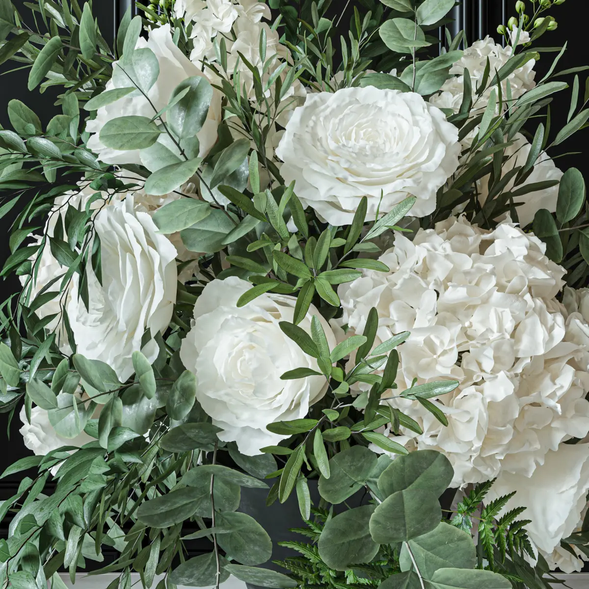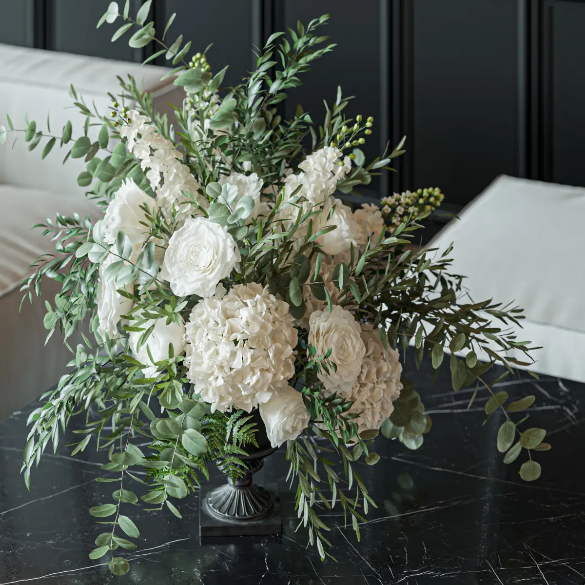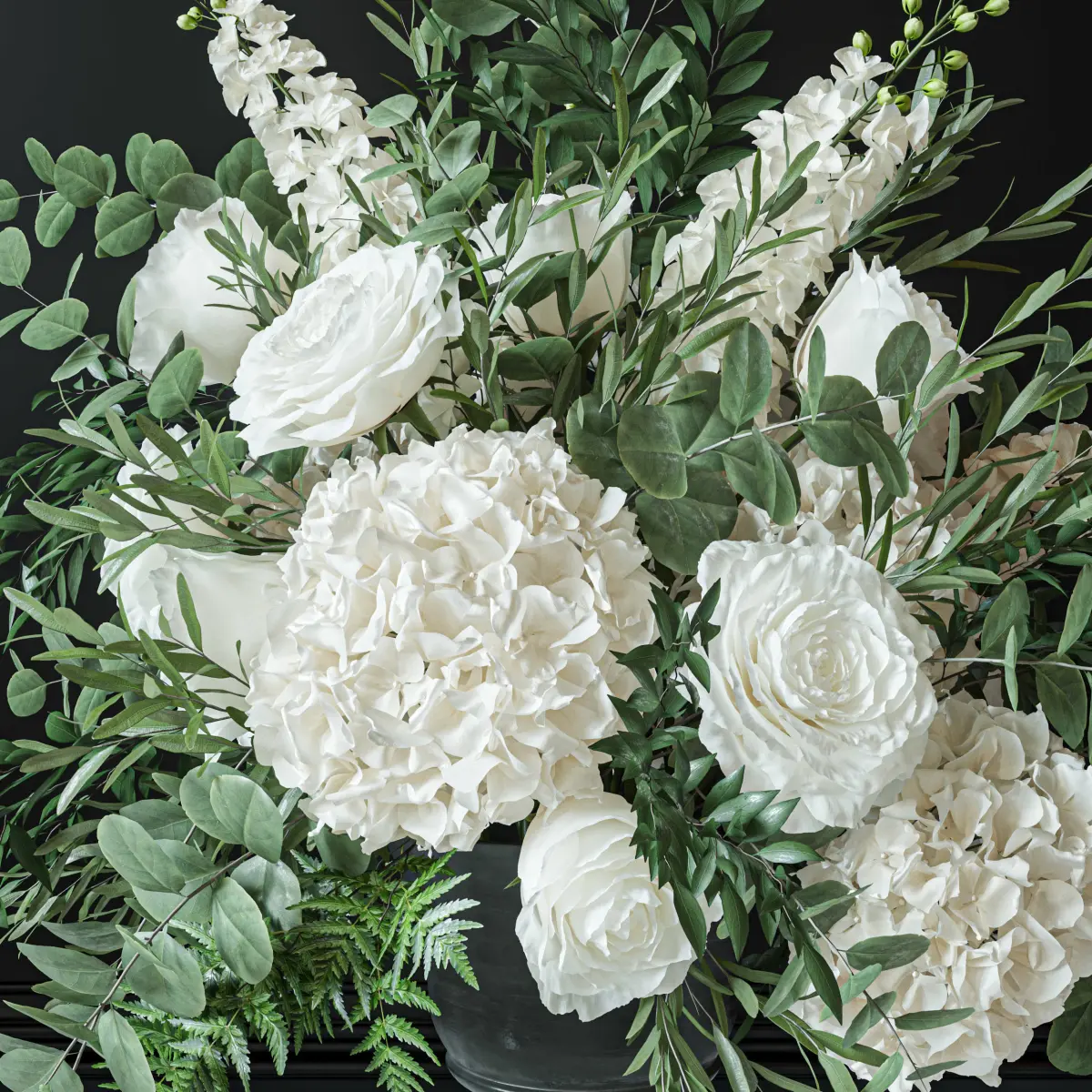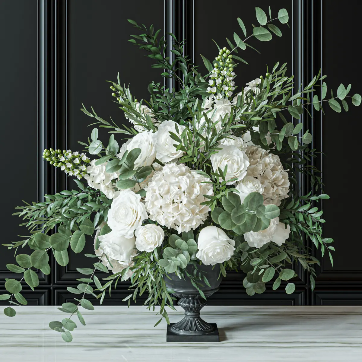 flower, vase, leaf, decor, decoration, set, rose, bouquet, wedding, delphinium, white, gold, floral, olive, eucalyptus,