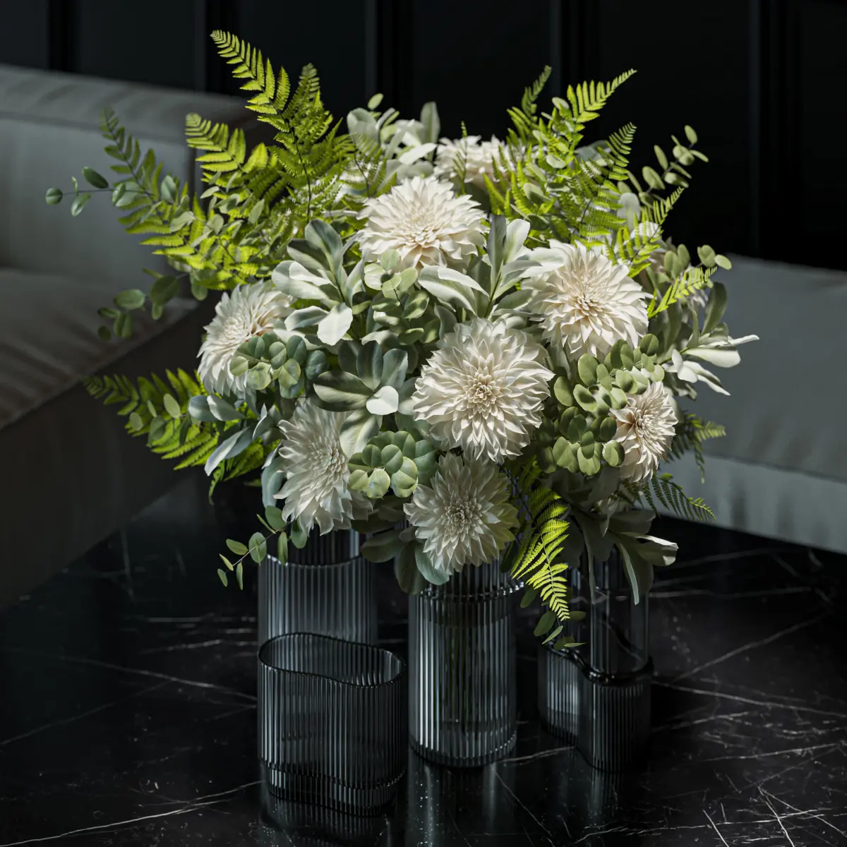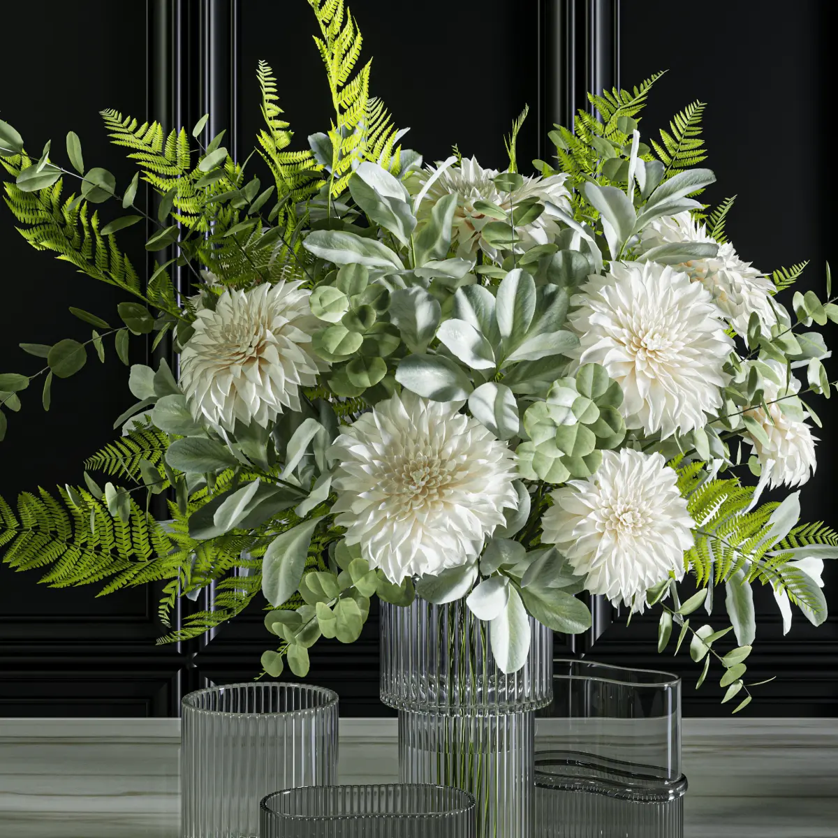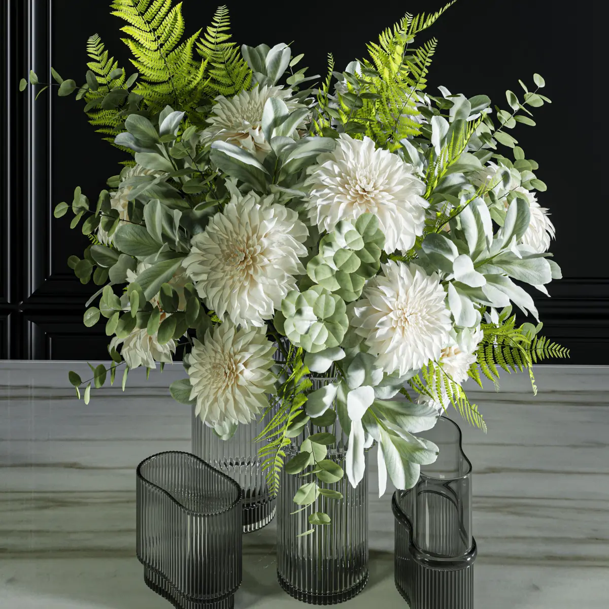 flower, vase, leaf, decor, decoration, set, bouquet, wedding, leaves, white, fern, dahlia, eucalyptus, glass,