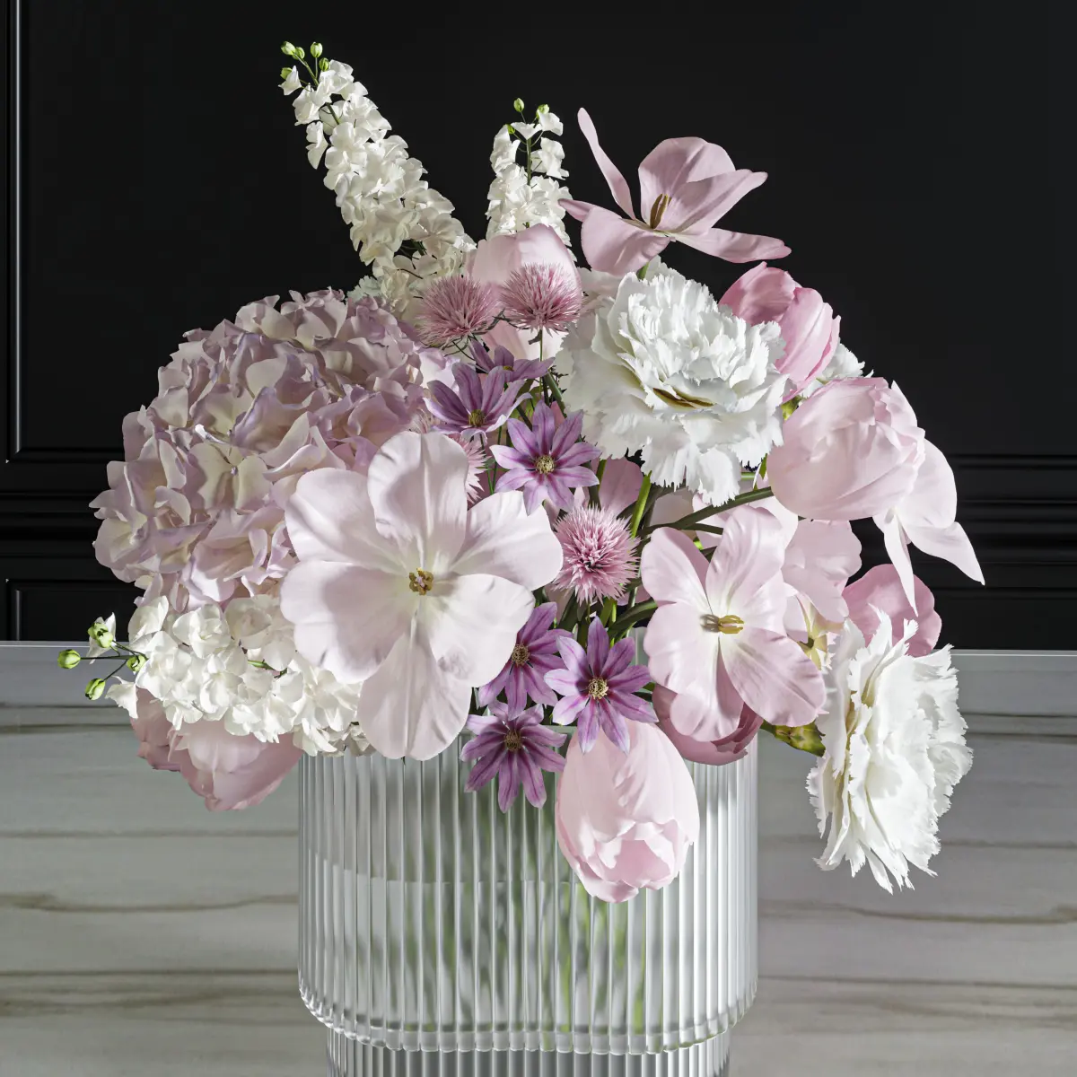 flower, vase, leaf, decor, decoration, set, bouquet, wedding, leaves, white, tulip, hydrangea, bloom, delphinium, carnation, frosted, blur,
