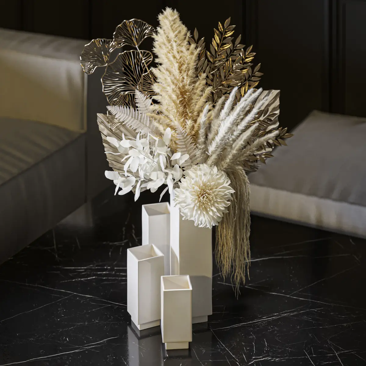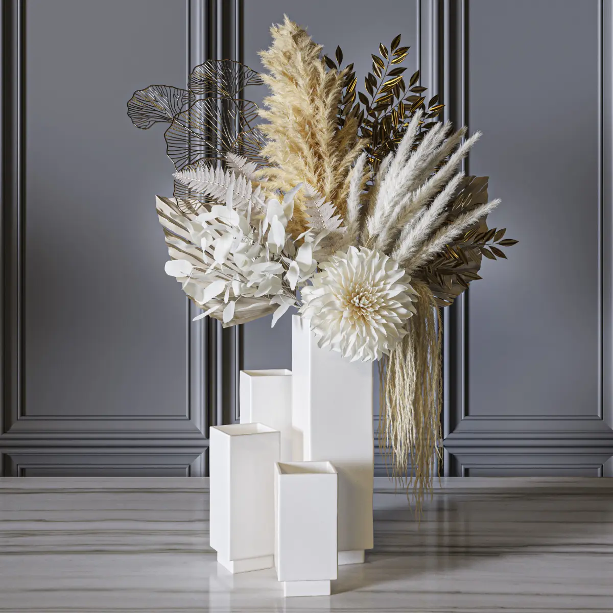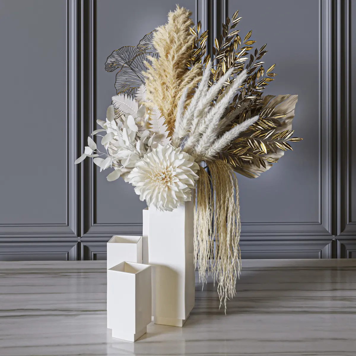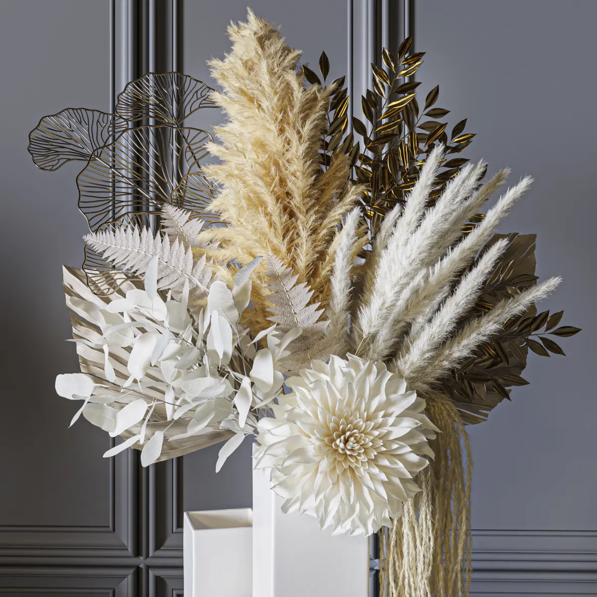flower, vase, leaf, decor, decoration, set, bouquet, wedding, leaves, white, pampas, grass, fern, palm, dahlia, gold, eucalyptus,