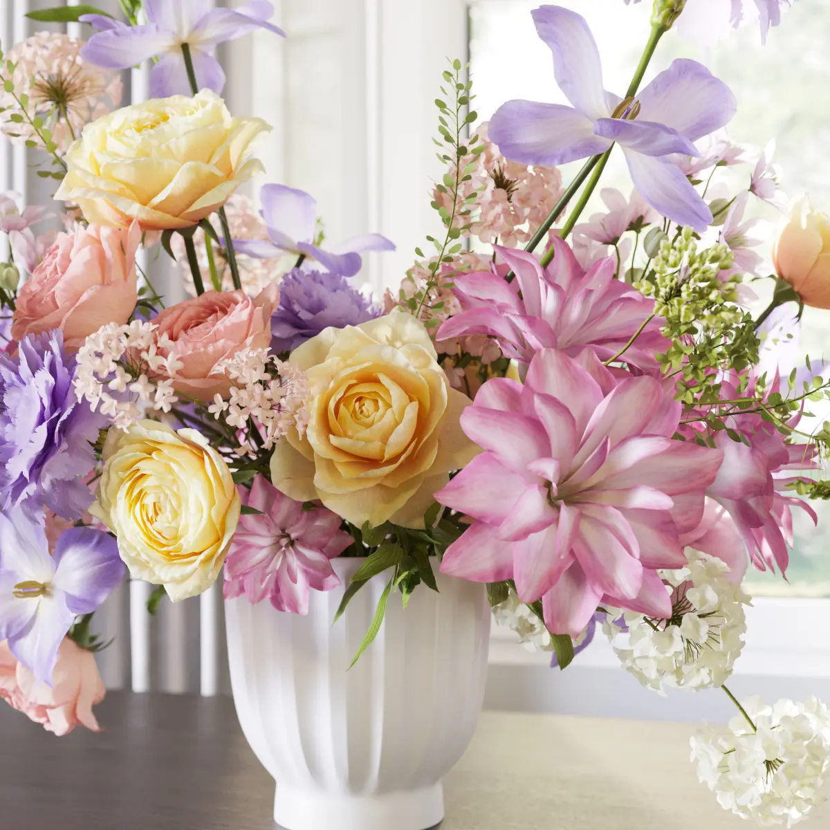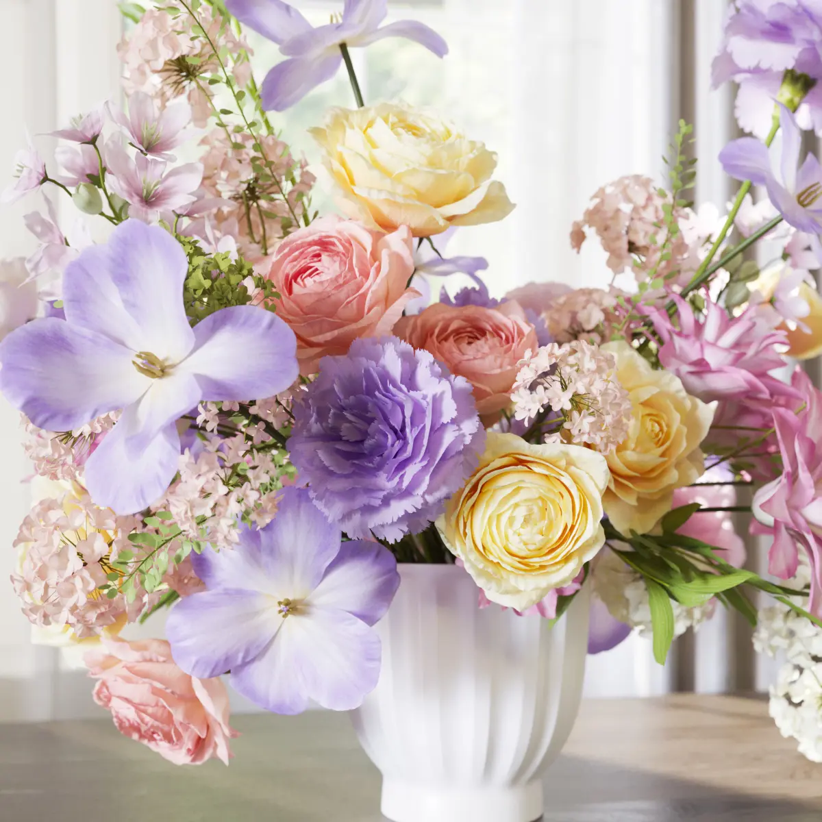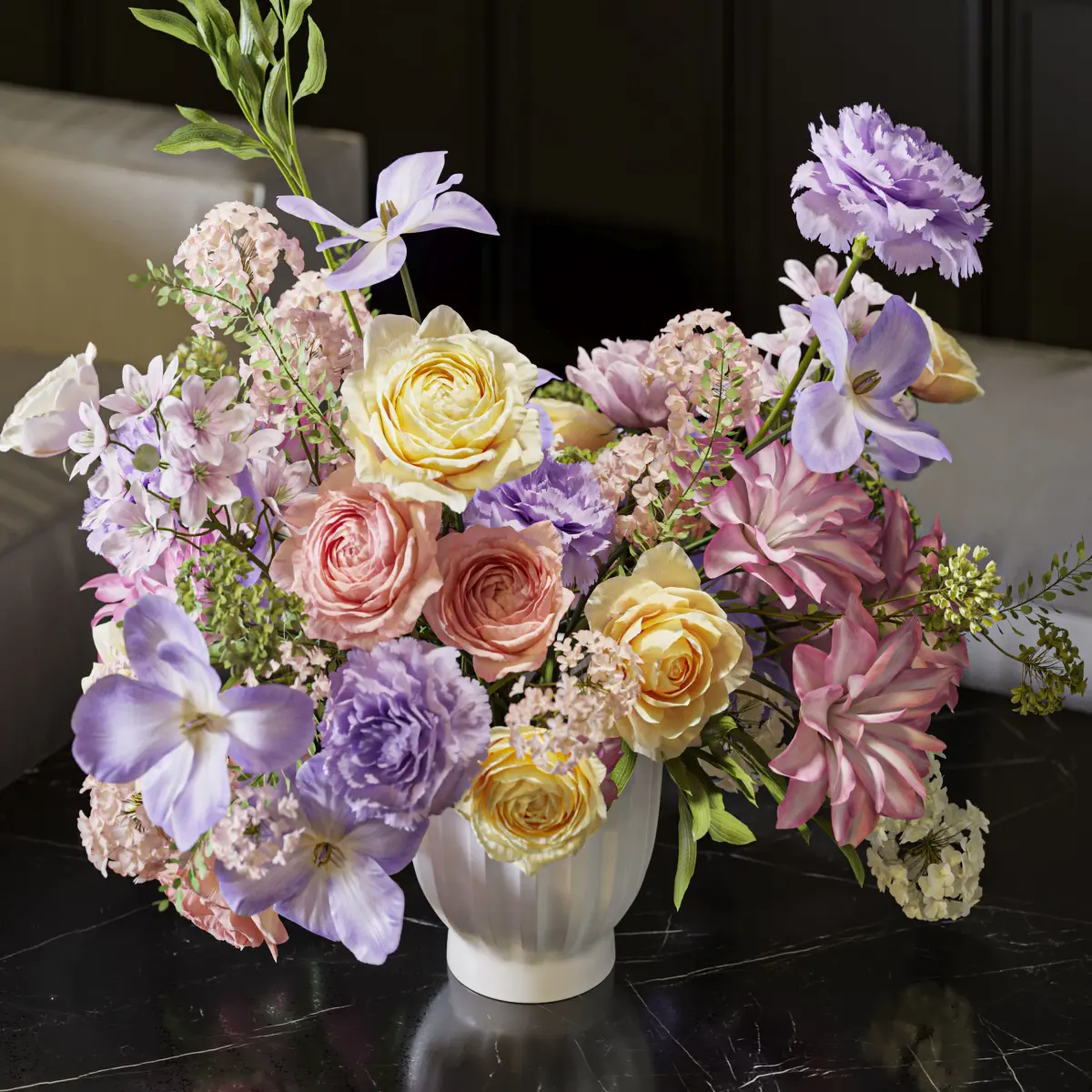 flower, vase, leaf, decor, decoration, set, bouquet, wedding, leaves, white, rose, carnation, orange, yellow, purple,