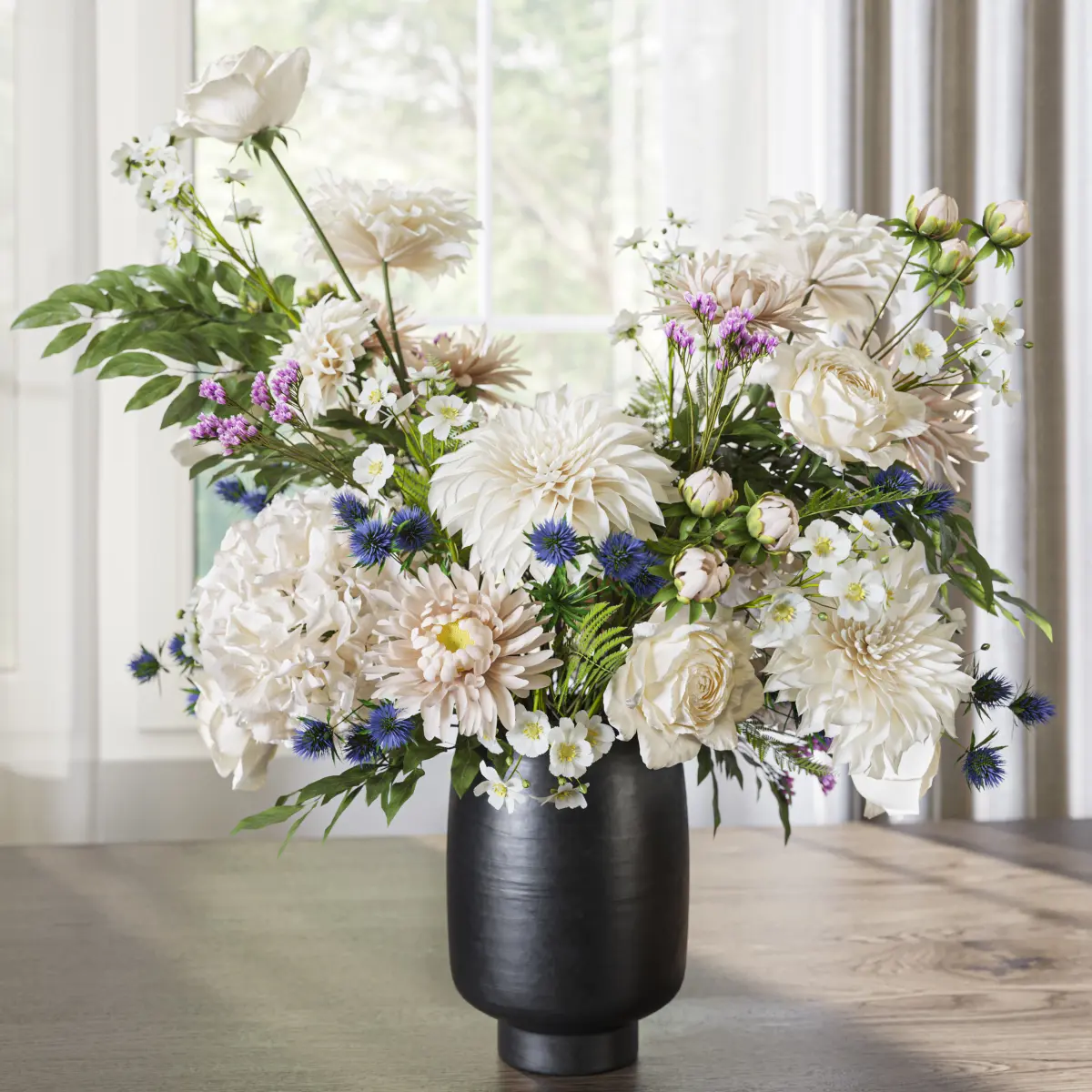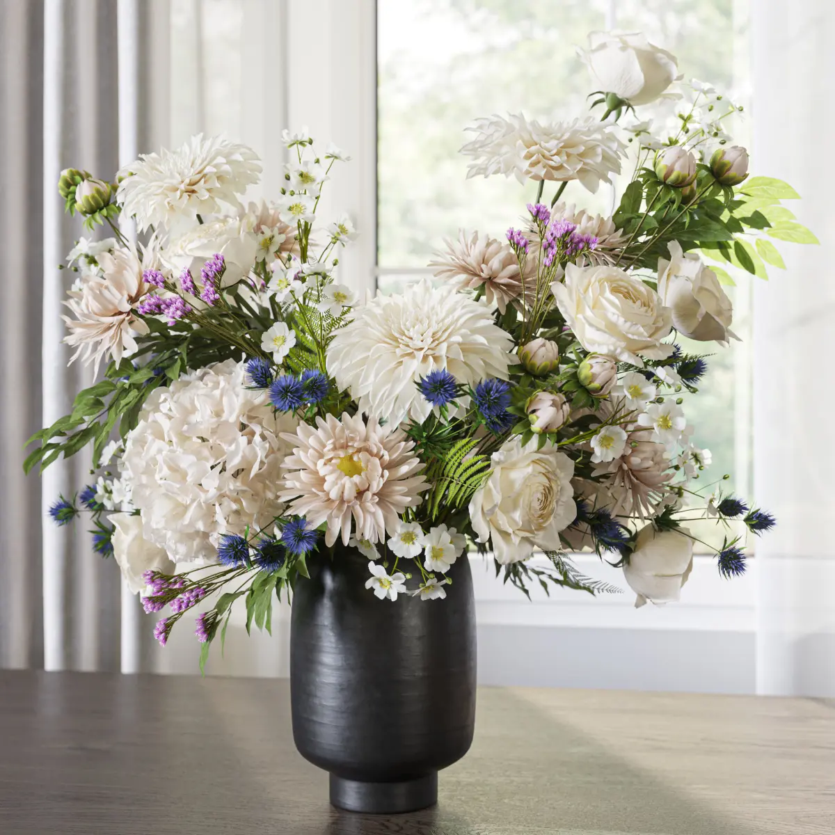 flower, vase, leaf, decor, decoration, set, bouquet, wedding, leaves, white, dahlia, rose, chrysanthemum, hydrangea, floral, green, statice, cosmos,