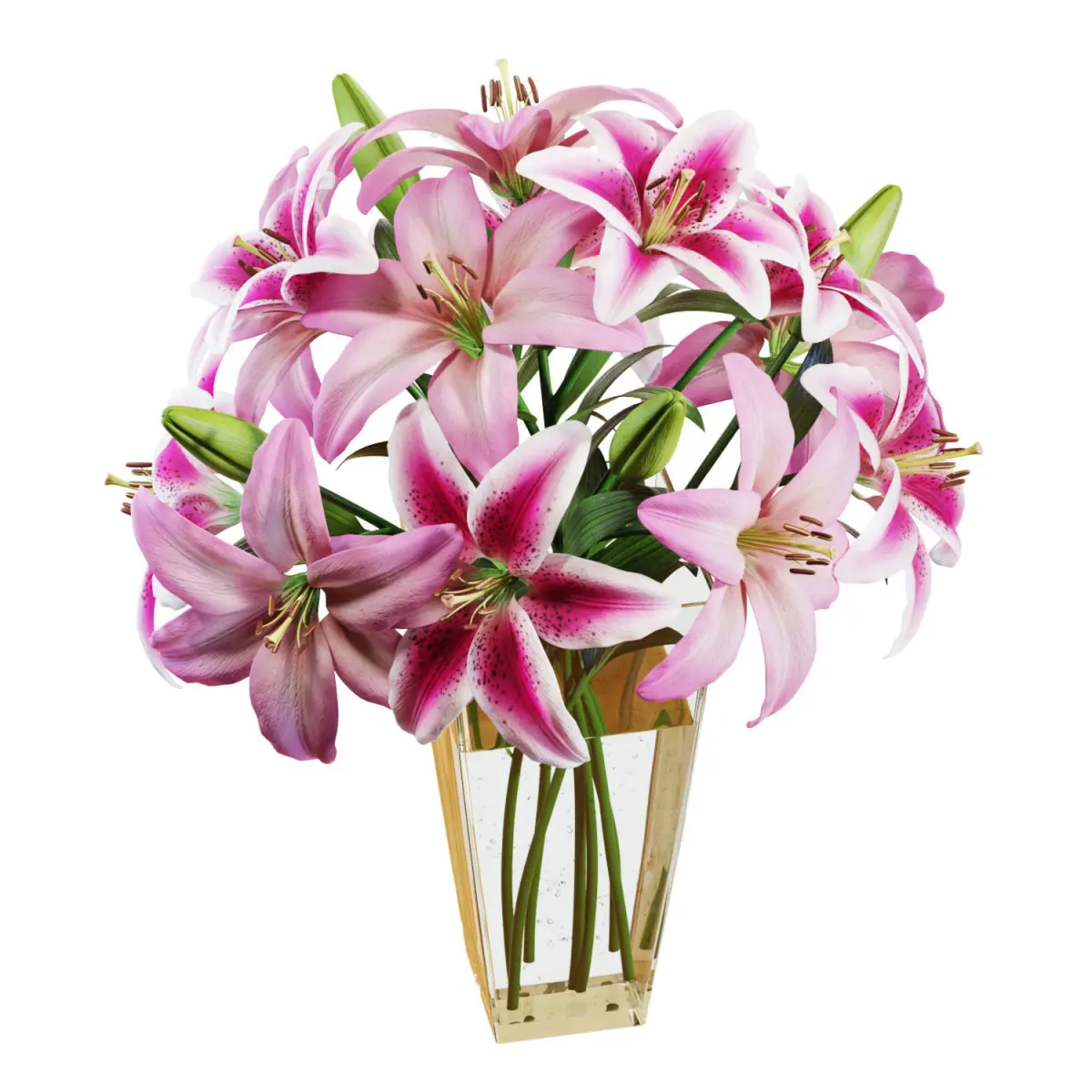 High-quality 3d model of a Pink Lilies Bouquet in a glass vase. 7 flowers.The model is fully subdividable.