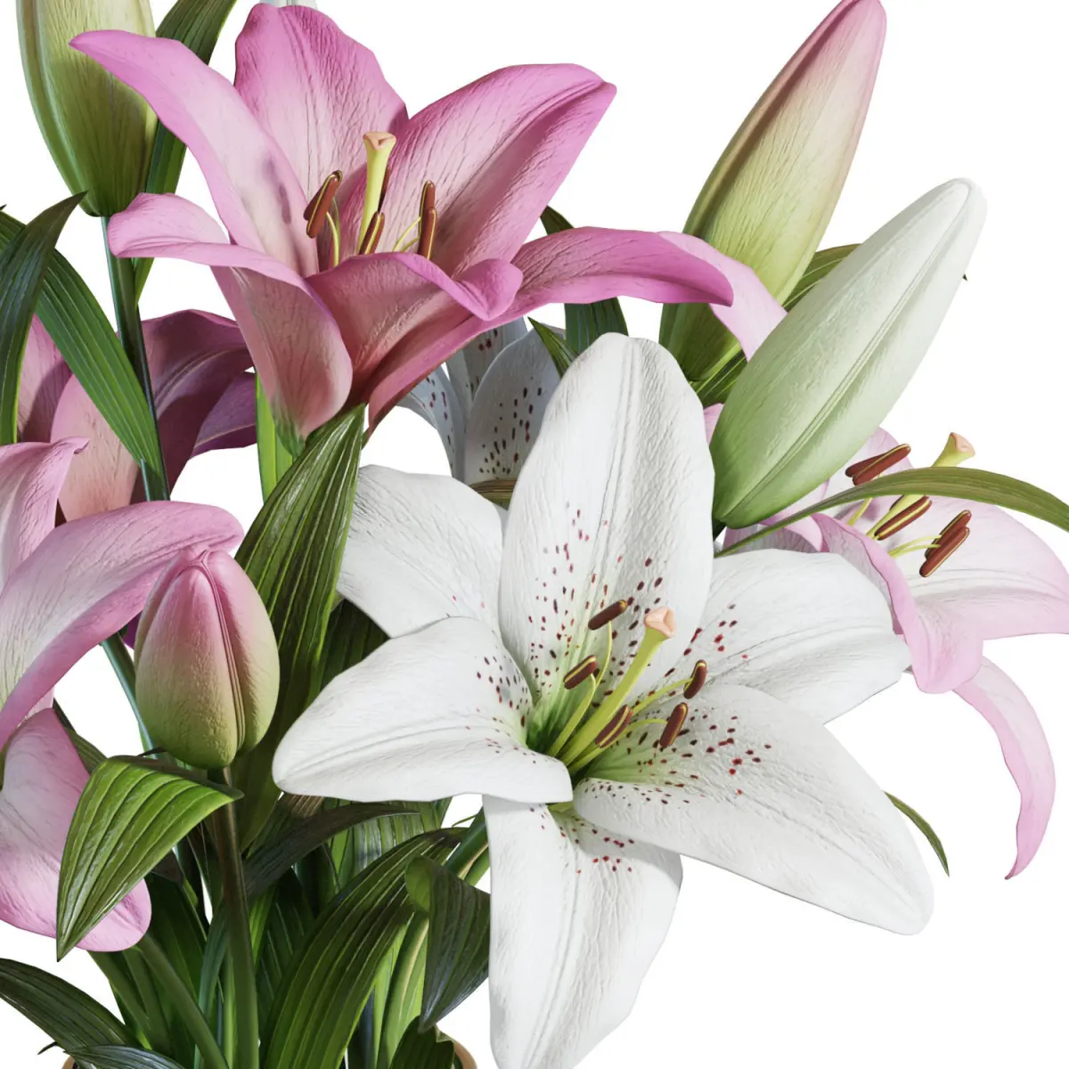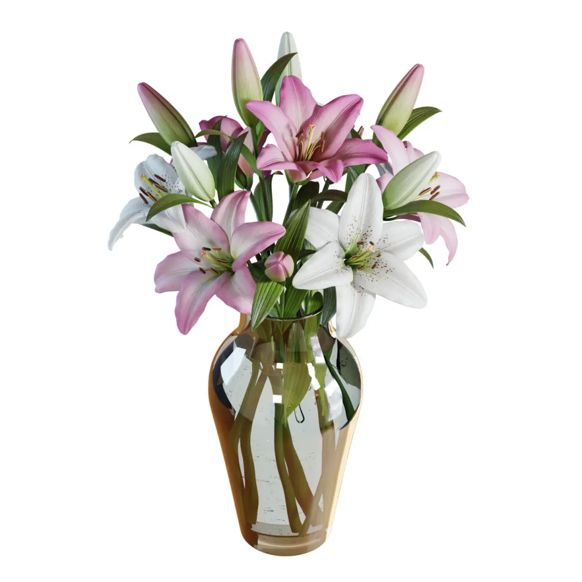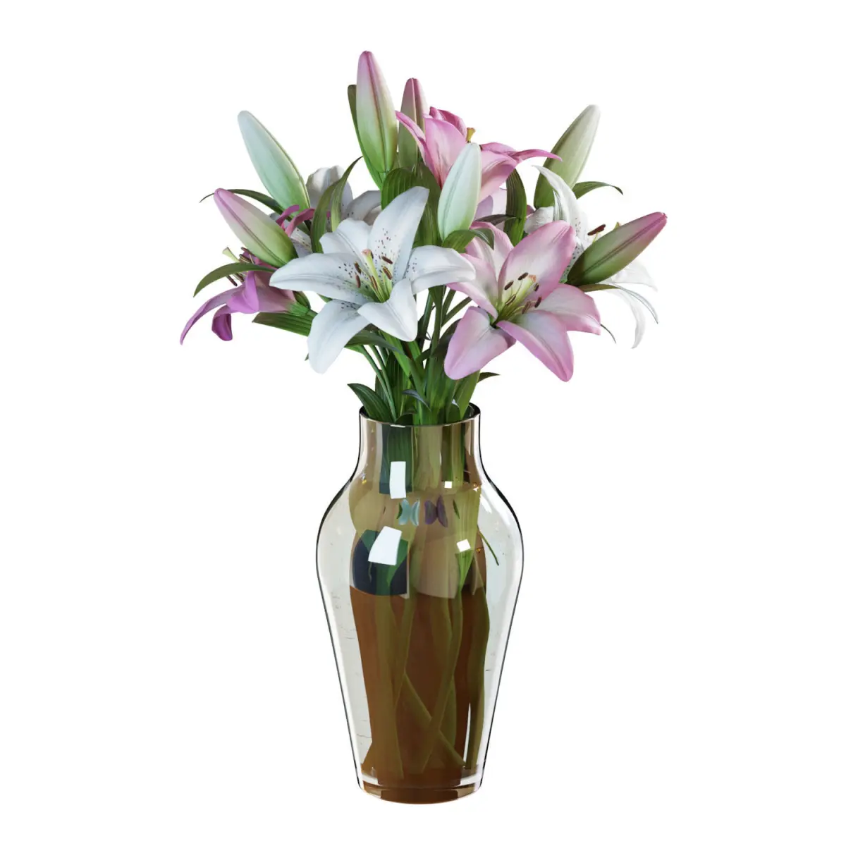 High-quality 3d model of a Pink and White Lilies Bouquet in a glass vase. 7 flowers.The model is fully subdividable.