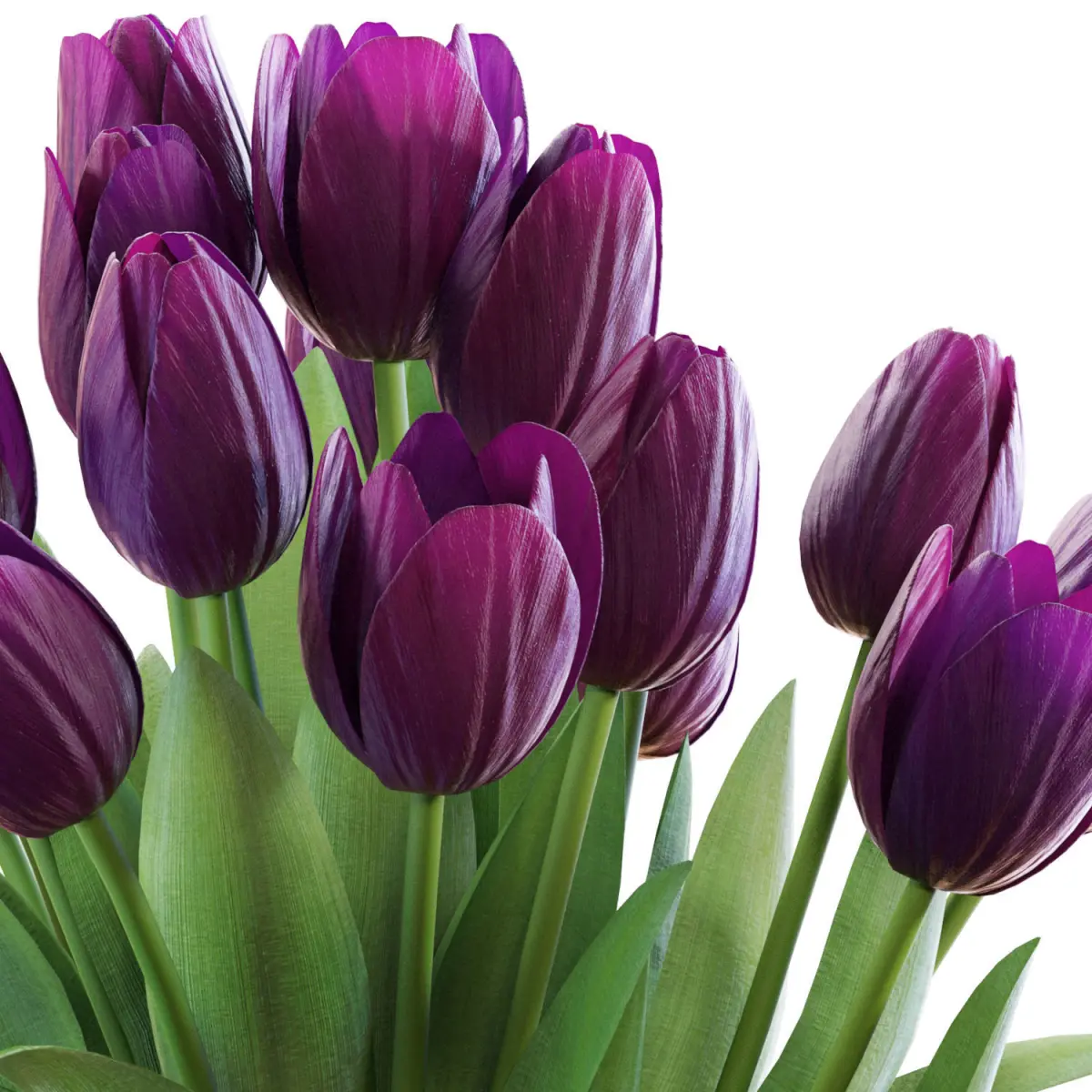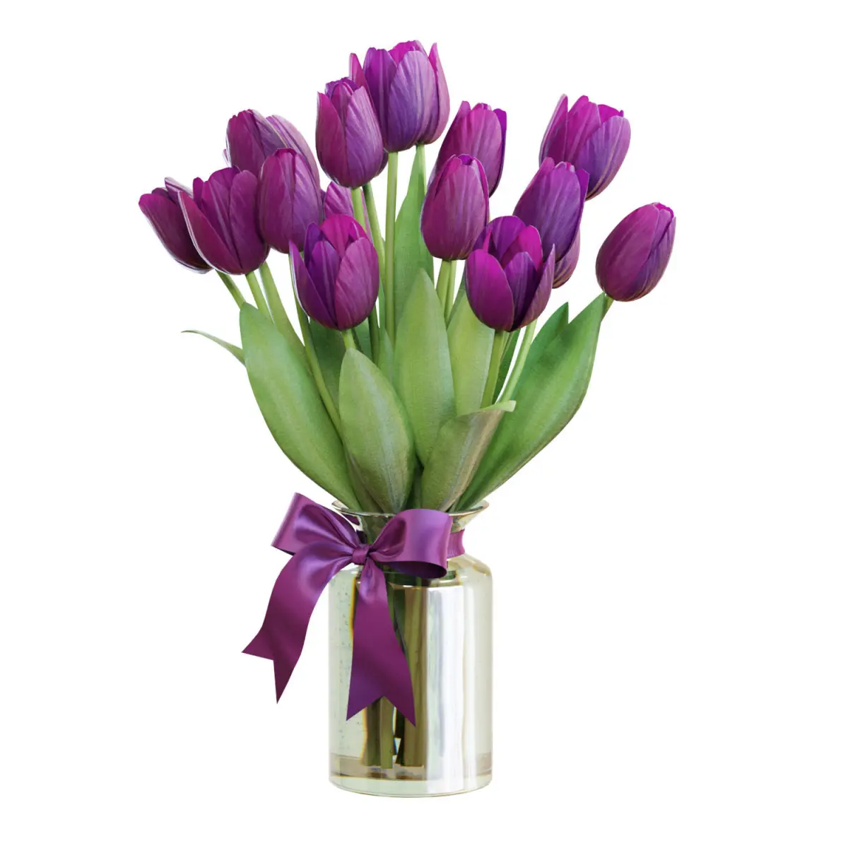 High-quality 3d model of a Purple Tulips Bouquet in a glass vase.The model is fully subdividable.