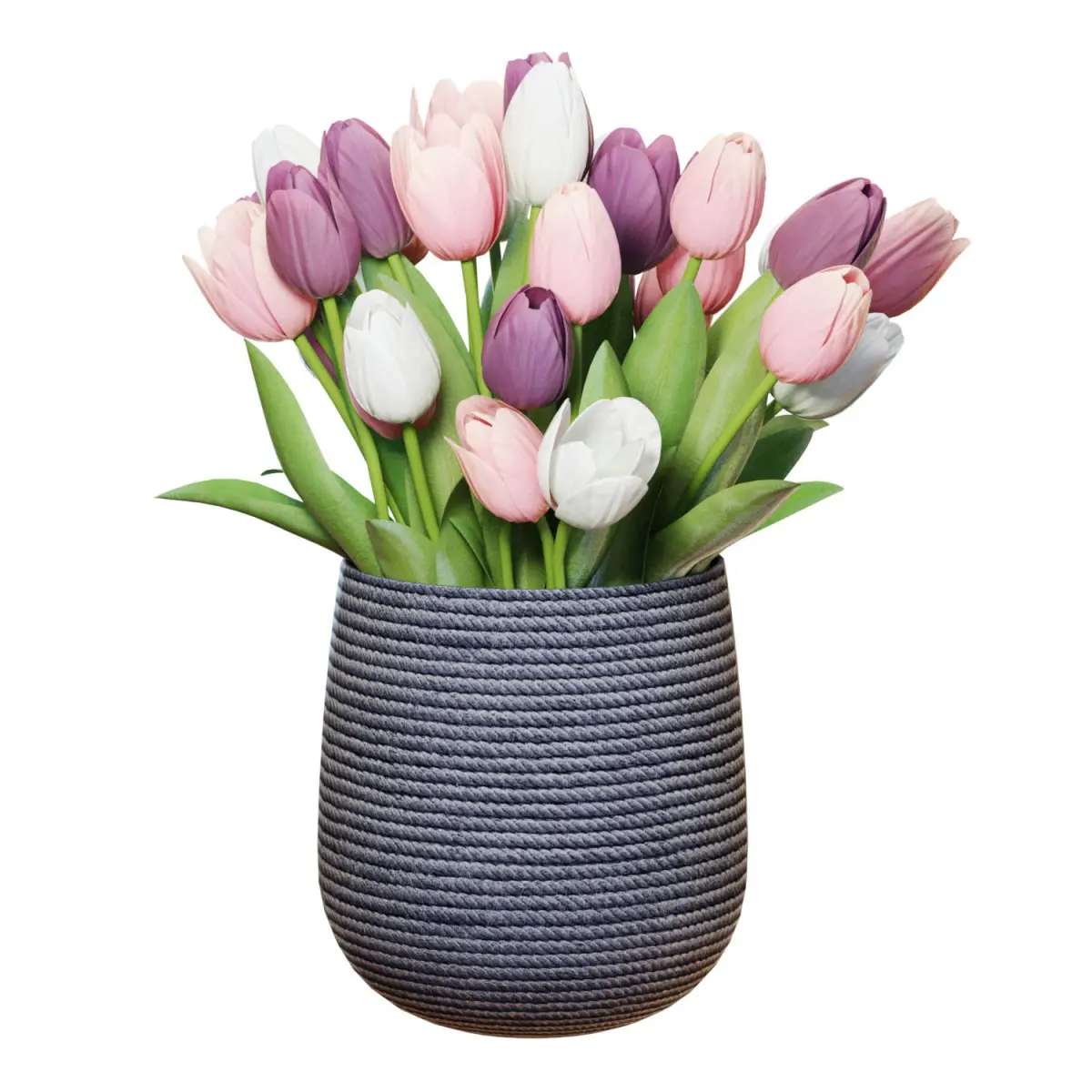 High-quality 3d model of a White, Pink and Purple Tulips Bouquet in a ceramic vase.