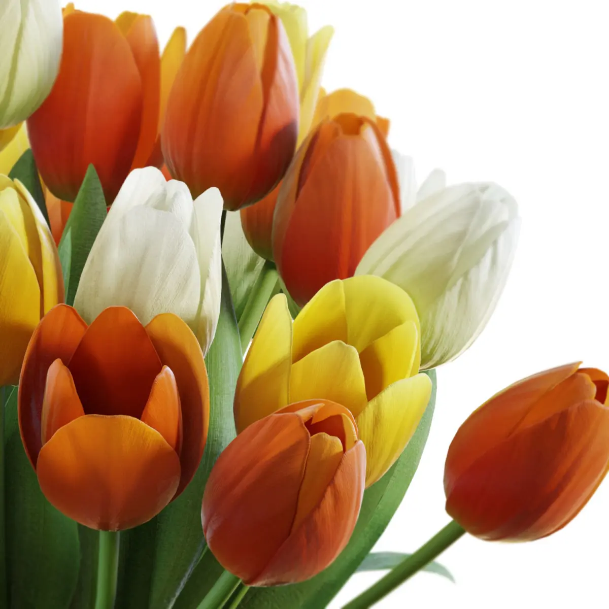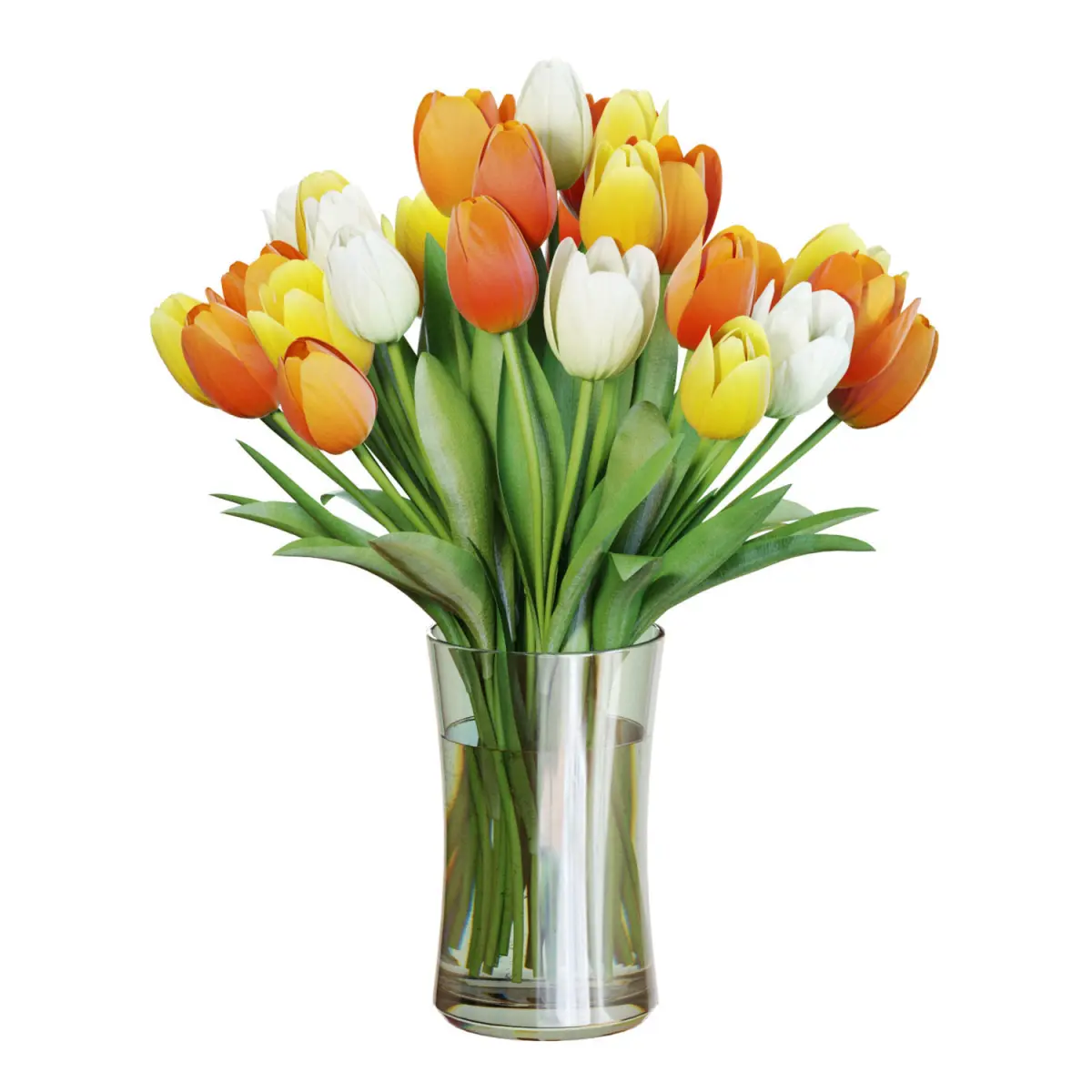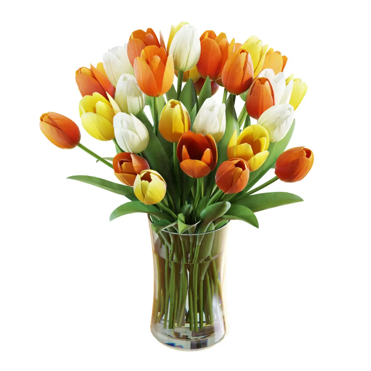 High-quality 3d model of an Orange, Yellow, and White Tulips Bouquet in a glass vase.
