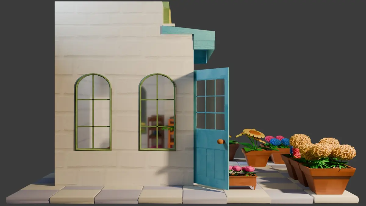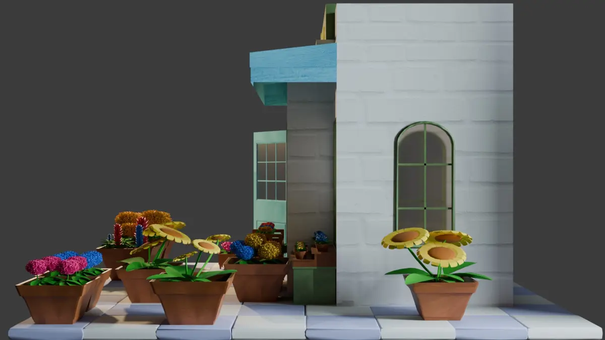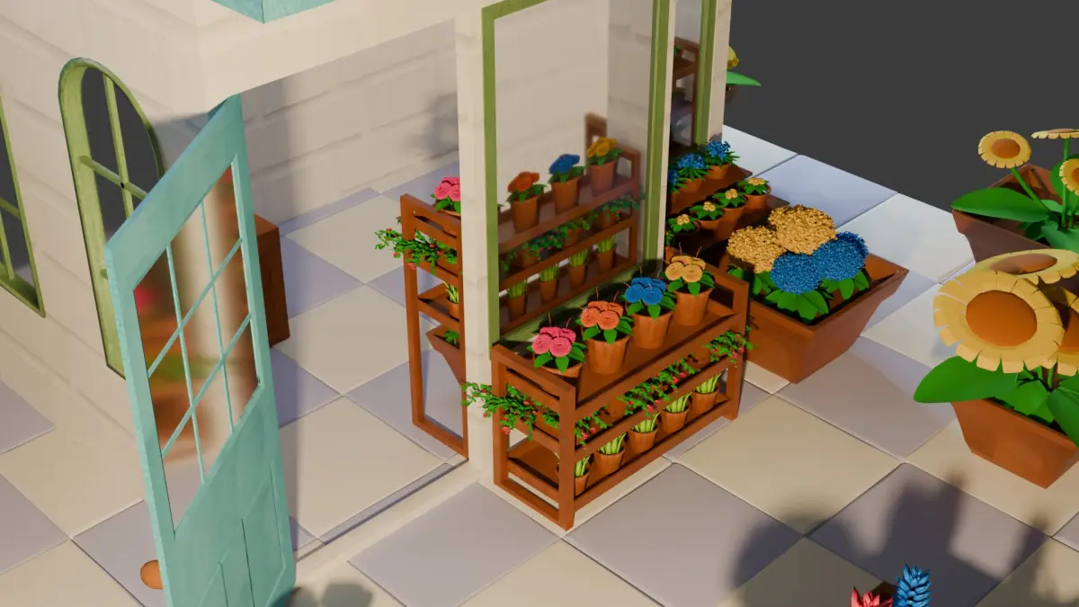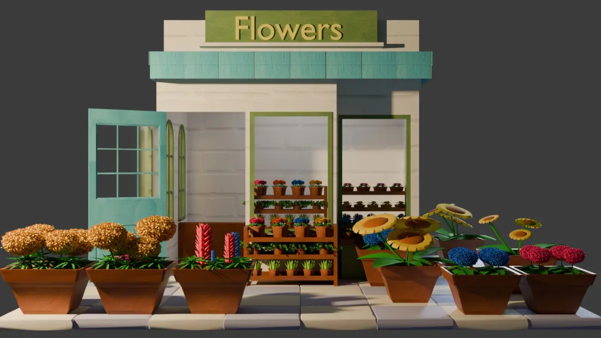 The Flower Shop 3D model is detailed, capturing the essence of a small, inviting neighborhood Flower Shop. The building stands on a tiled foundation, providing a clean base. The ship has a white brick exterior, which is simple yet charming, allowing vibrant elements like the Flowers and the Awning to pop visually.