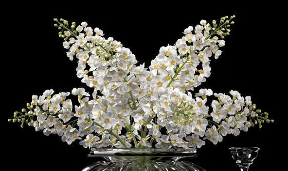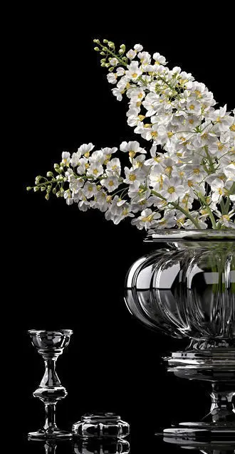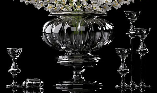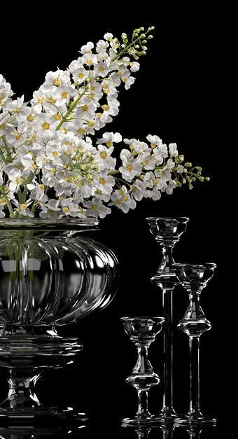 white flower bunch arranged in a glass vase with some supportive glass accessories.. looks perfect on any interior, designed in 3dsmax