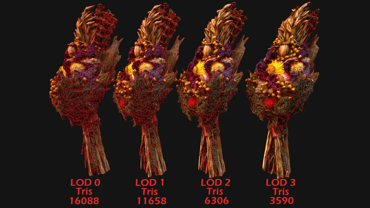 Game ready model .The model contains lods, detailed information on the images.Stylized and detailed Flowers Ukrainian Didukh 3 fully textured, sculpted and rendered with Physical based rendering (PBR) - Shown images have been rendered in Marmoset Toolbag .