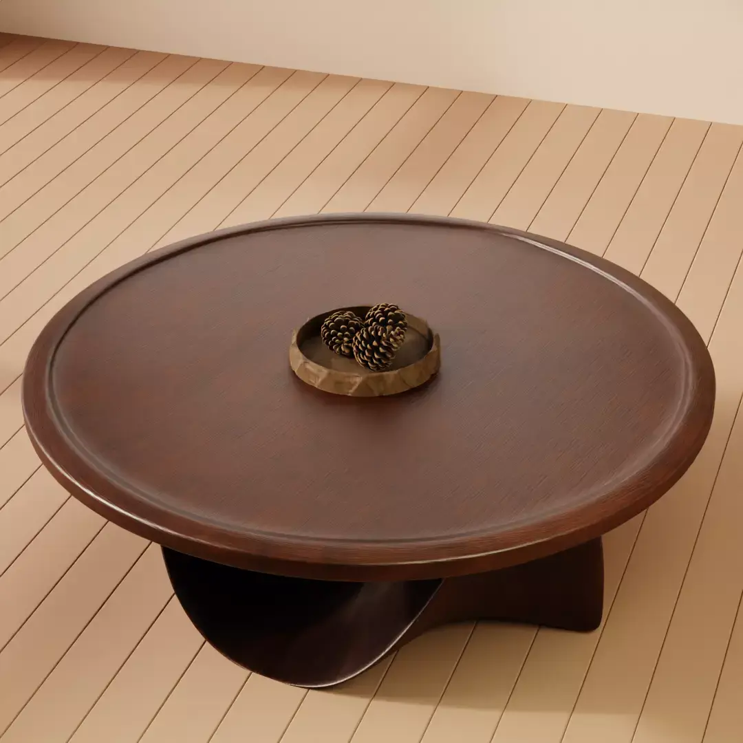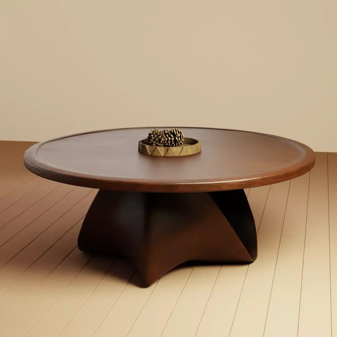 Introducing a premium designer round coffee table featuring a sculptural curved base and seamless wooden surface. This 3D model is ideal for architectural visualization, modern interior renders, and furniture showcase scenes.