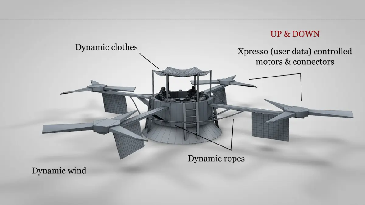 Very nice flying drone for C4D users. You can learn a lot about physics, dynamics and connections. It's my imagination I guess. If you use it in your projects please let me know how you do it!