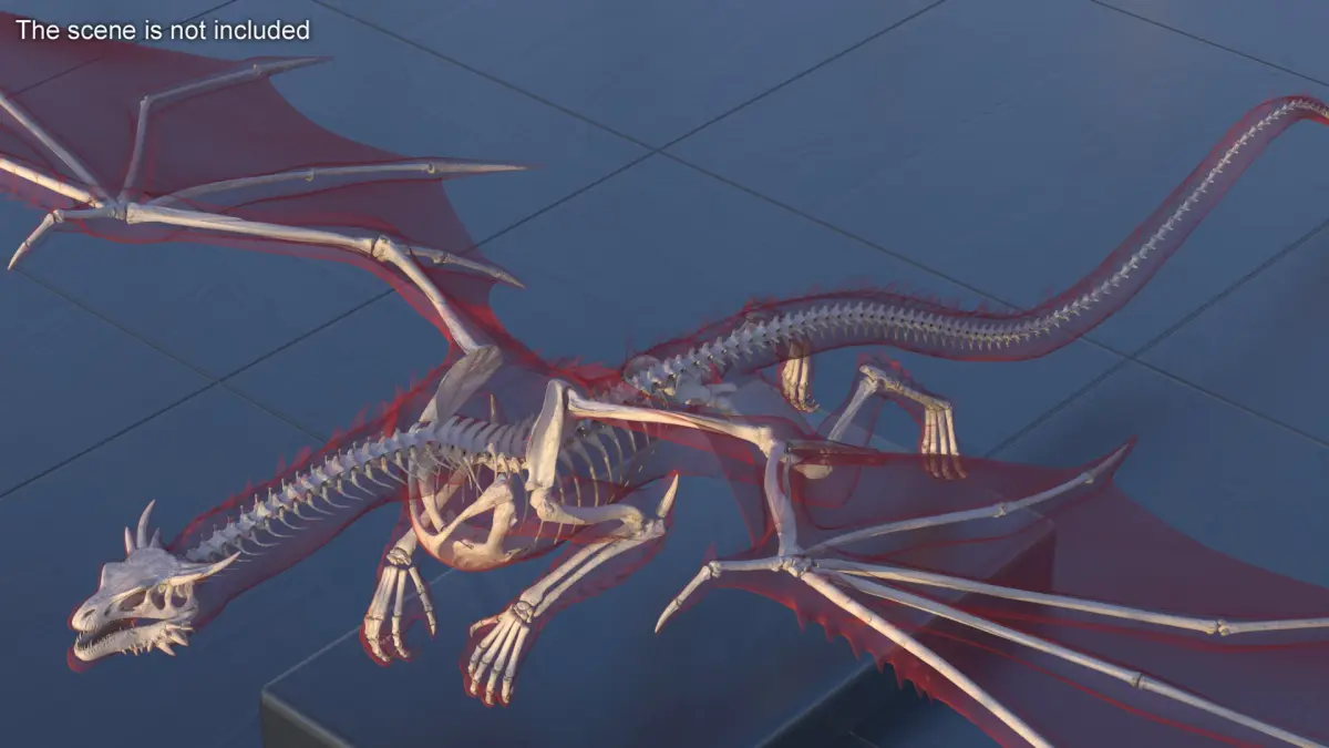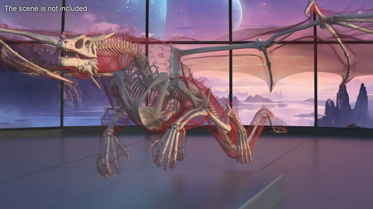 Flying Pose Dragon Skeleton in Transparent Shell is a high quality, photo real 3d model that will enhance detail and realism to any of your rendering projects. The model has a fully textured, detailed design that allows for close-up renders, and was originally modeled in 3ds Max 2020 and rendered with V-Ray. Renders have no postprocessing!