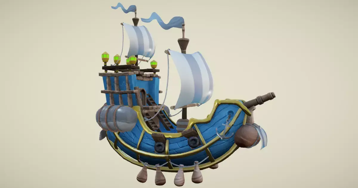 This flying ship model in hand-painted style is excellent for any kind of RPG, sea, strategy, adventure or VR game. It includes some nice details like cannons, barrel, ropes, and anchor.•Details:•The fan, sandbags, cannons, hatches, anchors and flags are separate/parented objects so they can be animated easily.