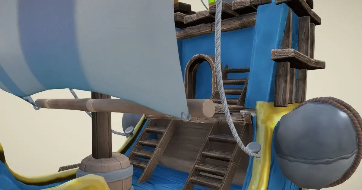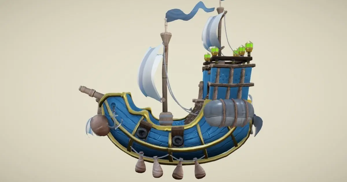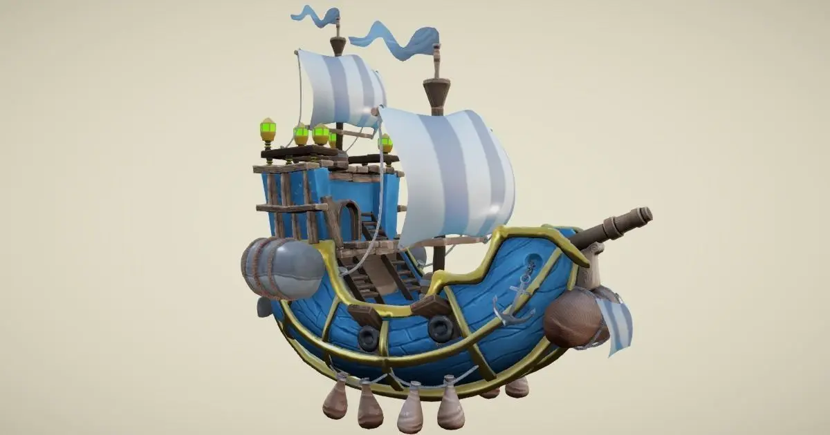 This flying ship model in hand-painted style is excellent for any kind of RPG, sea, strategy, adventure or VR game. It includes some nice details like cannons, barrel, ropes, and anchor.