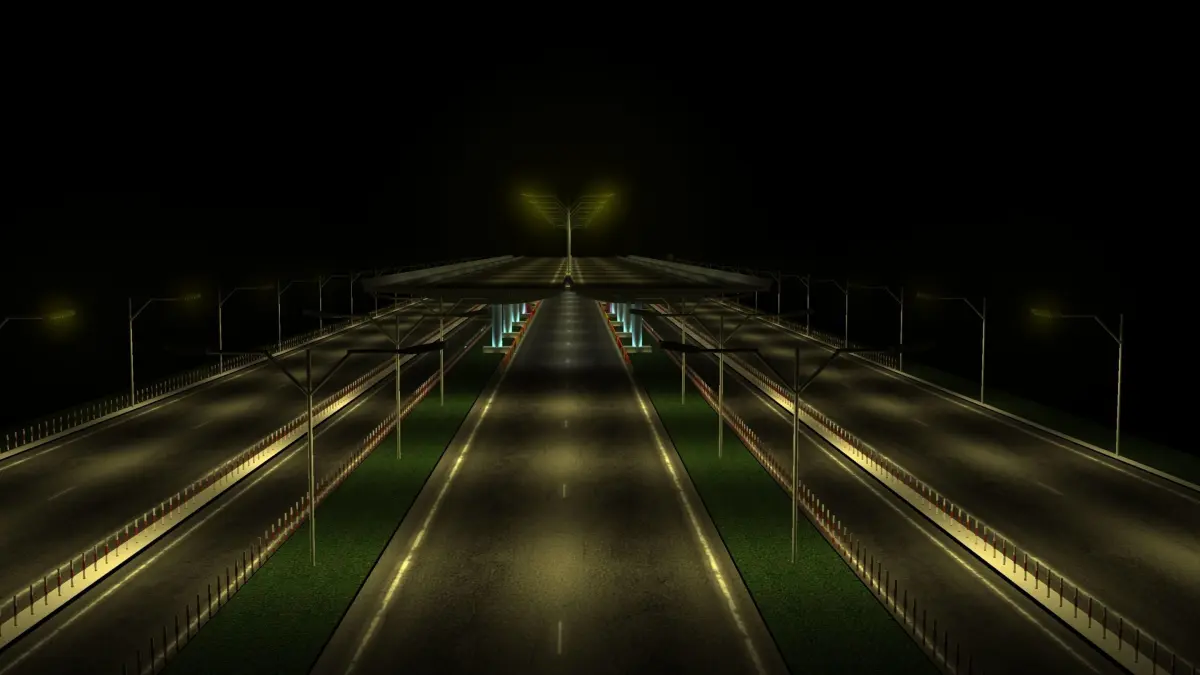 Flyover with lights. Excellent for night set ups. Also includes tower crane and Bus Rapid Transit System. Modern city infrastructure.