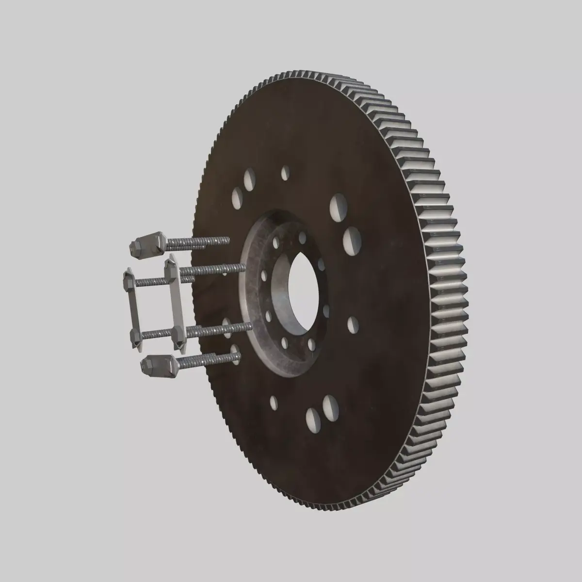 This model includes precise machining marks, chamfers, a full ring-gear tooth profile, and a bolted mounting rig, making it ideal for technical animations, engine assembly visualization, and educational or industrial VR/AR training.