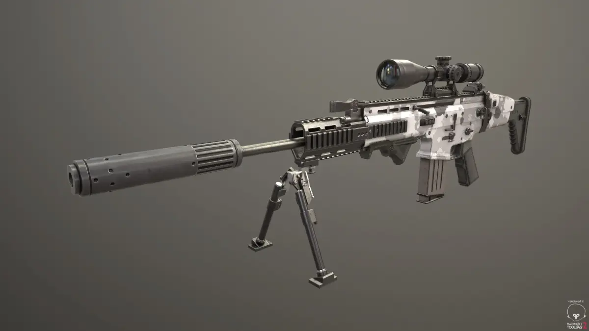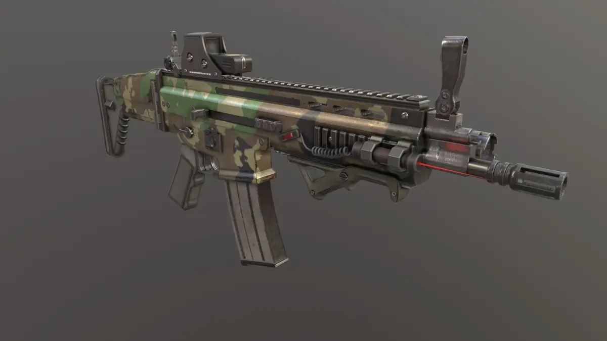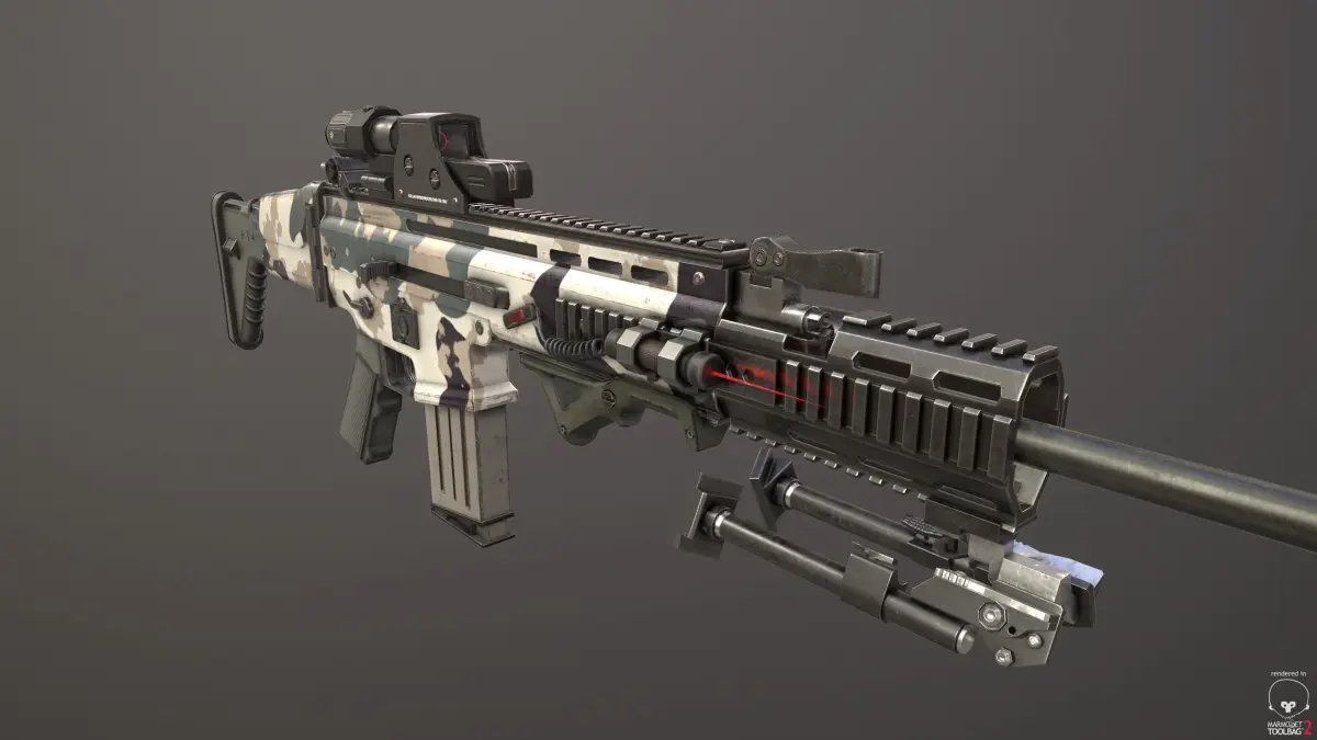 Combat assault rifle FN SCAR-L with attachments Package includes 1) Rifle body. 2) 2 types of magazines. 3) Cartridge. 4) Silencer. 5) Rail extender. 6) Bipod stand. 7) Holo scope. 8) Midrange optic scope. 9) Sniper scope. 10) Two types of hand grips.