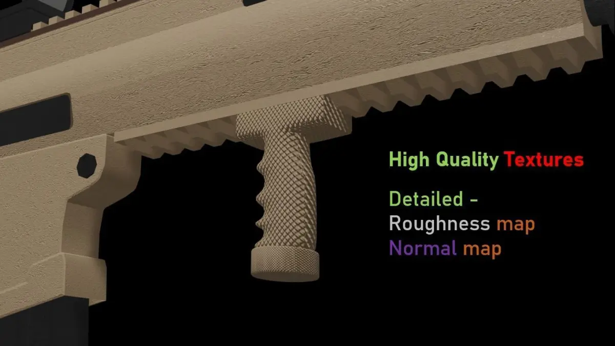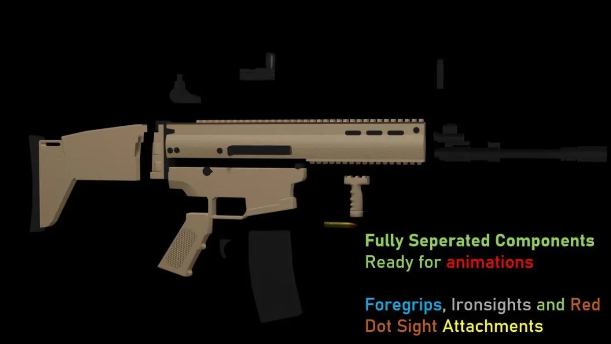 It contains a bullet model with textures for sampling as well, with seperated attachments and parts :Seperated StockSeperated RailSeperated Lower RailSeperated Red Dot SightSeperated IronsightSeperated MagazineSeperated Cocking PlateSeperate Body Parts and Barrell