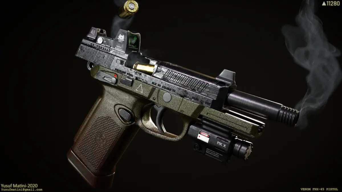 Based on the FNX-45 Pistol with a blood-venom finish.