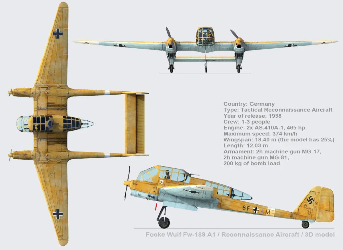 Country: GermanyType: Tactical Reconnaissance AircraftYear of release: 1938Crew: 1-3 peopleEngine: 2x AS.410A-1, 465 hp.Maximum speed: 374 km/hWingspan: 18.40 m (the model has 25%)Length: 12.03 mArmament: 2h machine gun MG-17, 2h machine gun MG-81, 200 kg of bomb load
