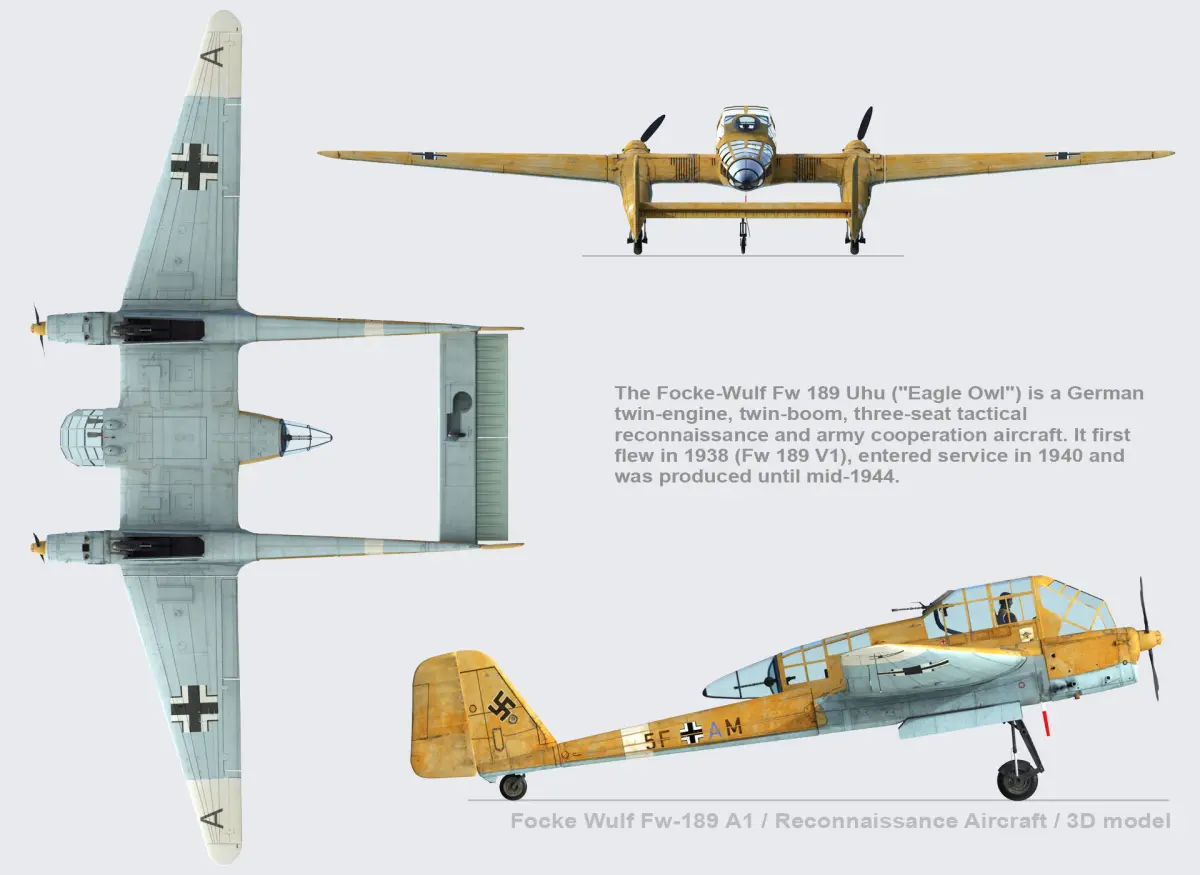 The Focke-Wulf Fw 189 Uhu (Eagle Owl) is a German twin-engine, twin-boom, three-seat tactical reconnaissance and army cooperation aircraft. It first flew in 1938 (Fw 189 V1), entered service in 1940 and was produced until mid-1944.