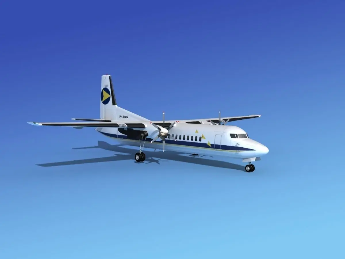 This high quality model is built near to scale with lots or detail. The model is fully textured and comes with all textures and materials as shown. There are many animateable features such as props, ailerons, flaps, elevators, rudder, landing gear retract and landing gear doors close and open. The model also has plenty of detail in the aerodynamics and radio antenna, pitot tubes and other features. This model is available in several different formats.The Fokker 50 is a turboprop-powered airliner, designed as a refinement of and successor to the highly successful Fokker F27 Friendship. It has better avionics, aerodynamic improvements and more payload capacity. The aircraft was in production until Fokker was liquidated in the late 1990s. Over 200 were built. Dozens are still in service around the world.