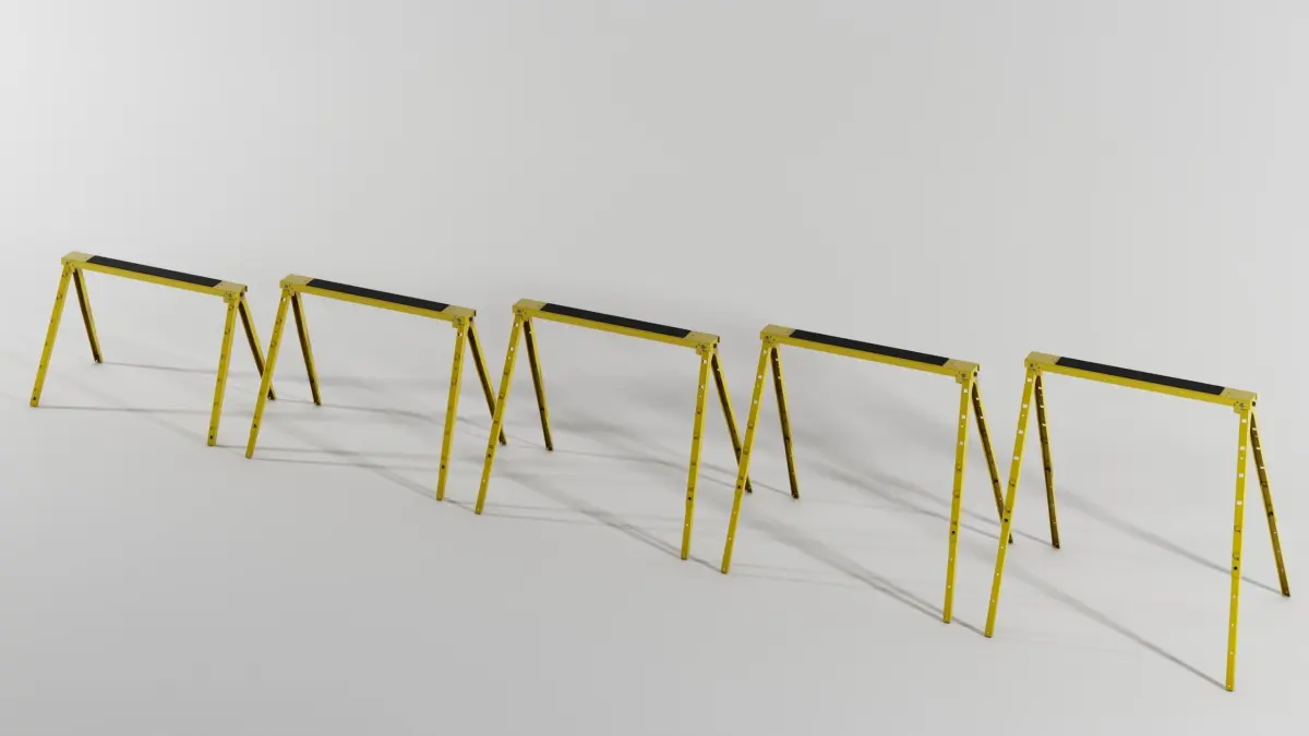 Foldable and adjustable sawhorse made out of metal with non-slip foam on topEasy to transportMax load 100 kg / 220 LBSAdjustable hight : 60,70,80,90,100 cm (2' , 2'3'' , 2'7'', 3' , 3'3'' )Width 10 cmLenght 100 cm