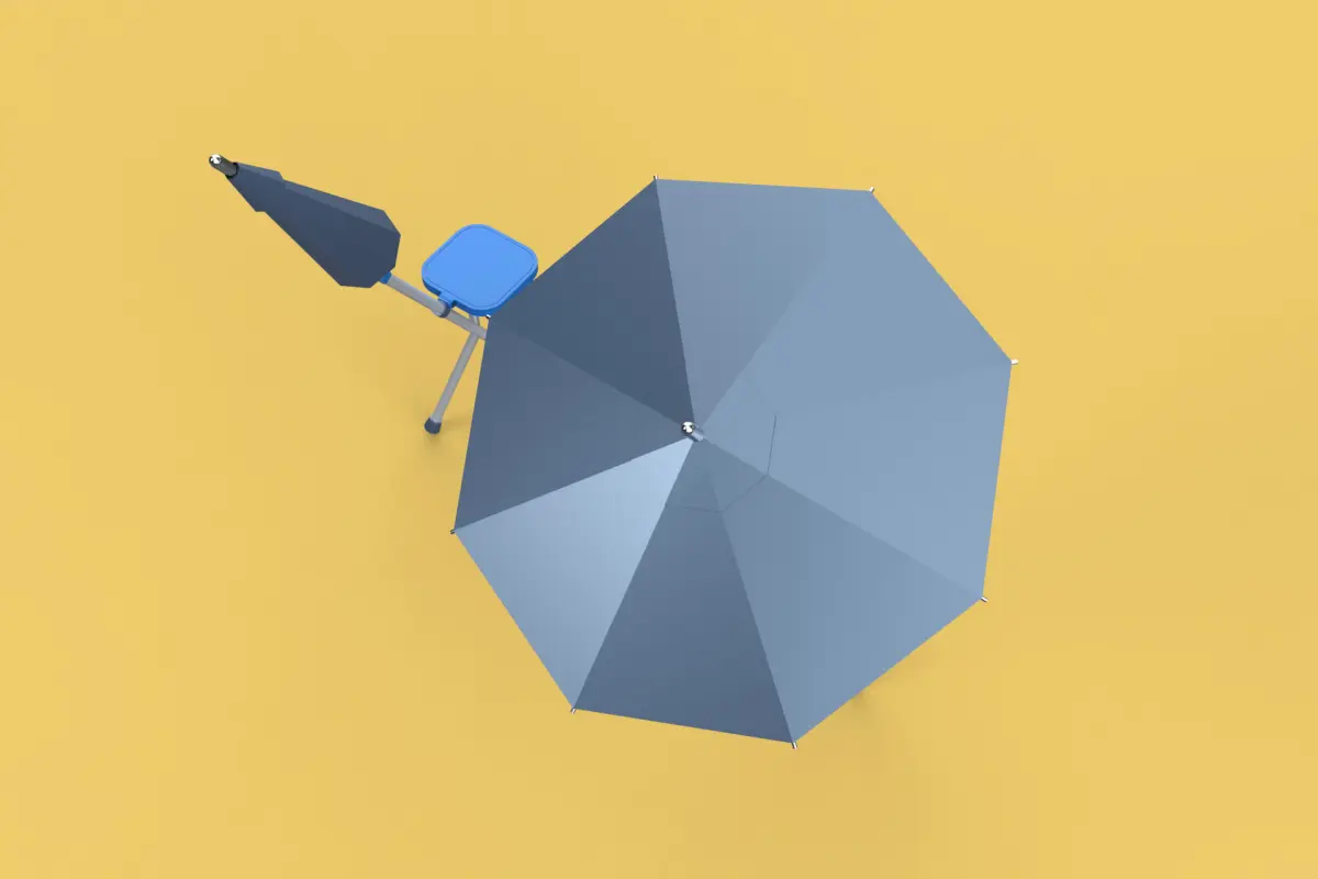 Folding Chair/Seat Stool: In the left configuration, the product is shown as a small, portable chair or stool. It features a blue, square-shaped seat and a collapsible frame with four legs, likely made of metal. The frame is designed to fold compactly for easy storage and transport.Umbrella Canopy: A dark-colored (possibly black or dark gray) umbrella canopy is attached to a central pole extending upward from the seat. The umbrella is fully opened, providing shade.Walking Cane/Pole/Stick: In the right configuration, the umbrella canopy is folded down into a narrow, elongated shape, effectively turning the product into a walking cane or stick. The seat portion is still visible in its folded state, suggesting that it can be used for occasional seating.Convertible Design: The product is designed to be easily converted between a chair with an umbrella and a walking cane. This is likely achieved through a mechanism that allows the umbrella canopy to be folded and locked into a streamlined position.Handle: The central pole features a blue handle, indicating a comfortable grip for use as a walking cane.Functionality and Design: