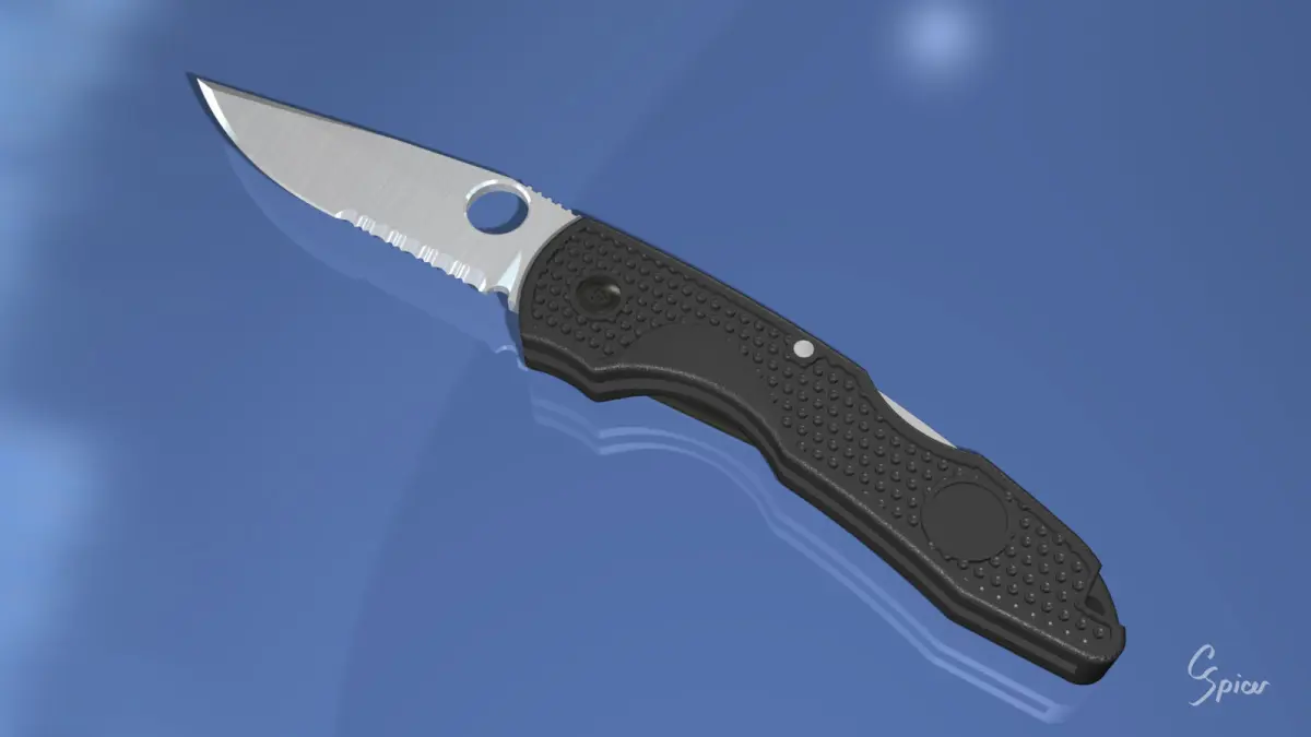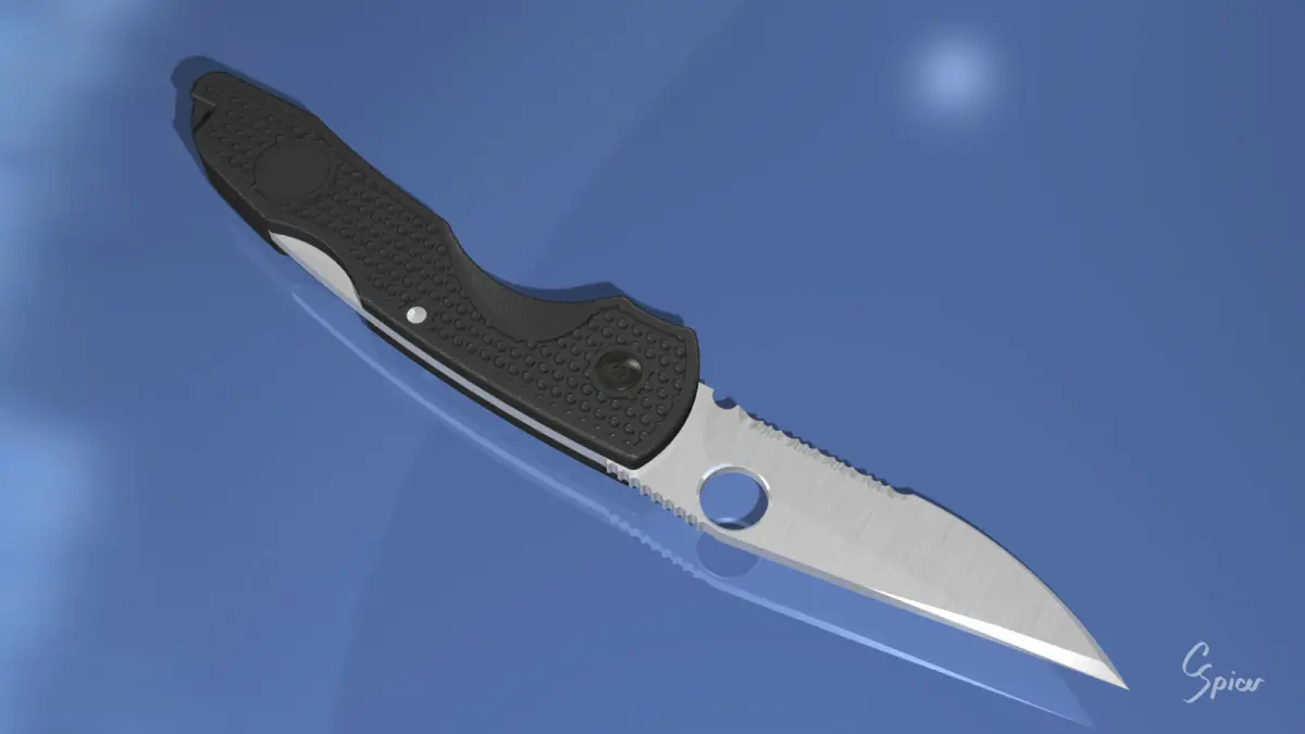 Folding pocket knife, ready for use in CGI applications. Modeled in Carrara Studio and provided in multiple file formats. Blade is partially serrated and locks open. Polymer handle features high-grip texture, belt clip, and screws, all modeled in 3D.
