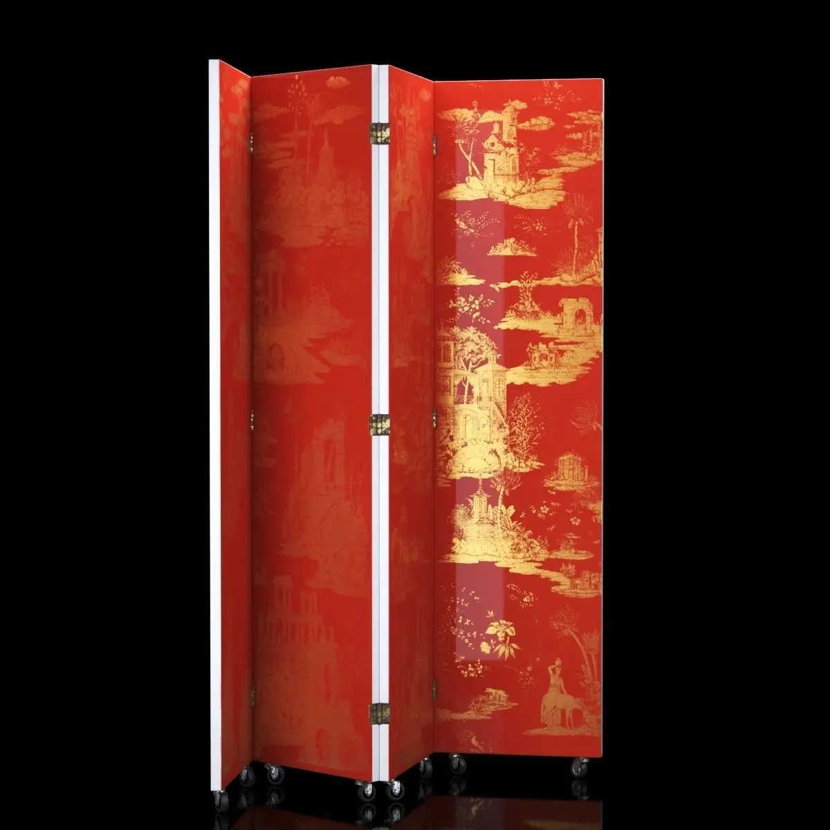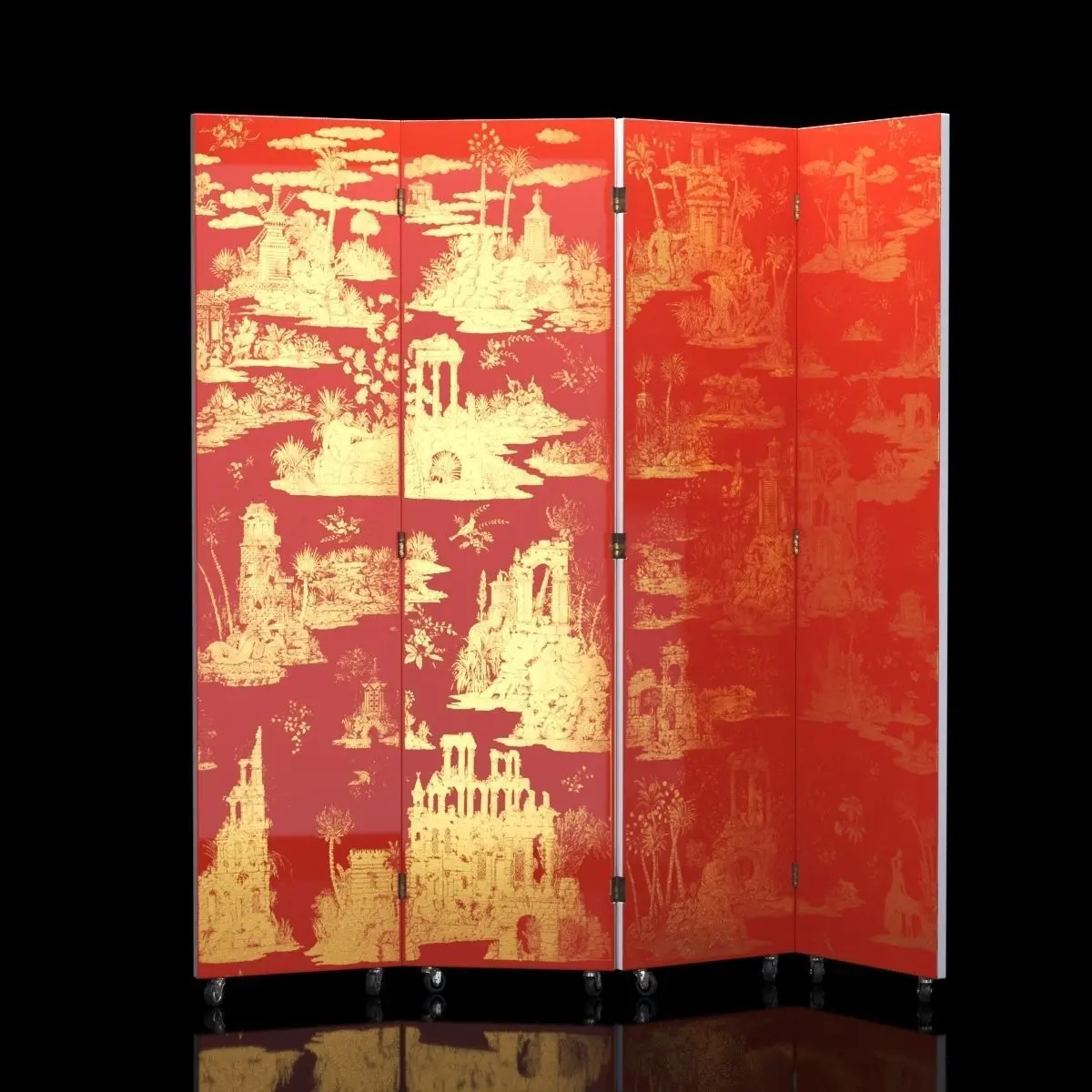 Red and gold Foldable Screen Gran Coromandel by Fornasetti, circa 1950 Dimension: 205x205x4 cm