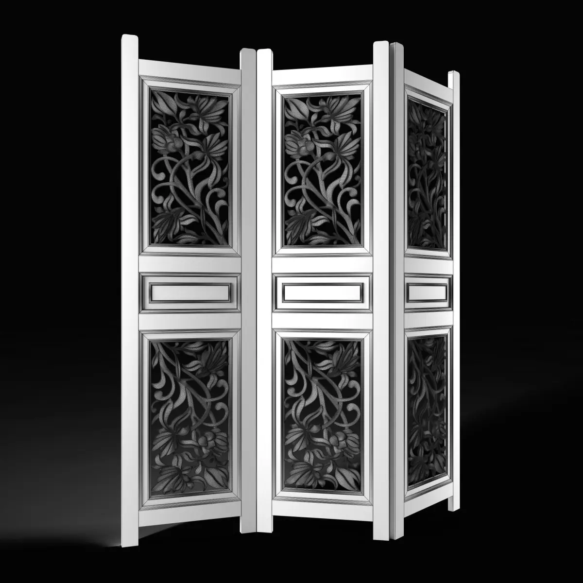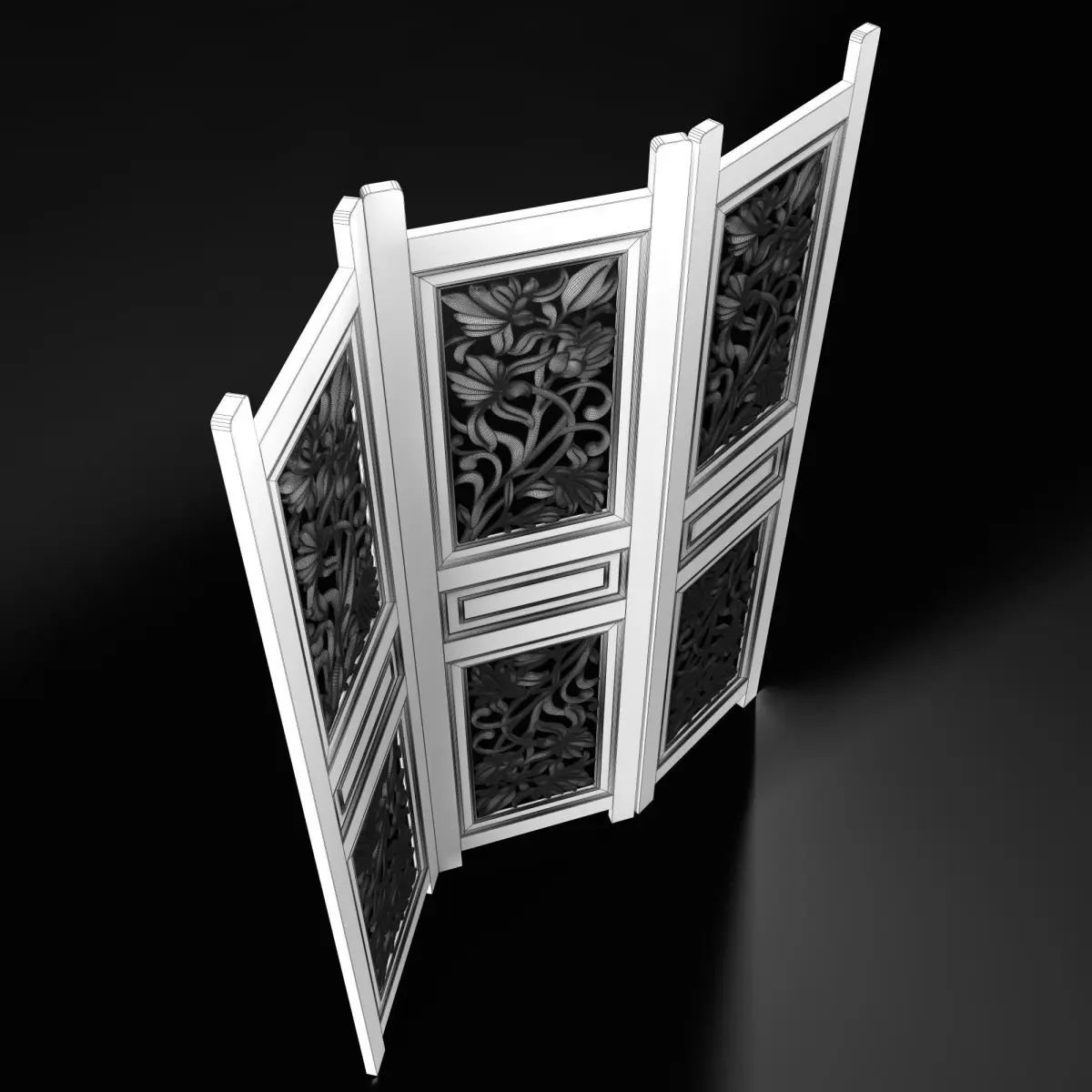 High-quality 3D model of a folding screen with a carved insert.
