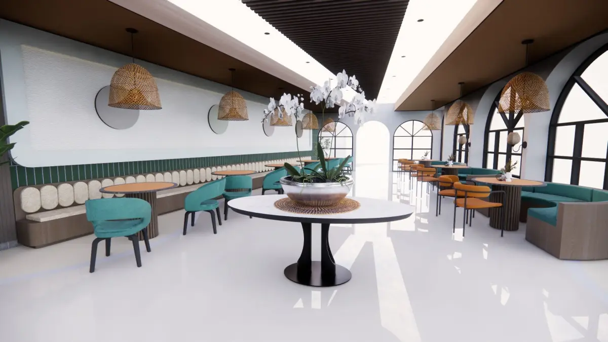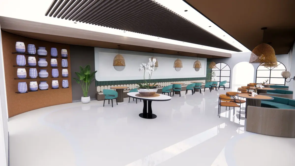 It is a foodcourt with a combination of classic modern concepts applied to a restaurant/café that is decorated with ornaments and a space that is suitable and enjoyable for its visitors