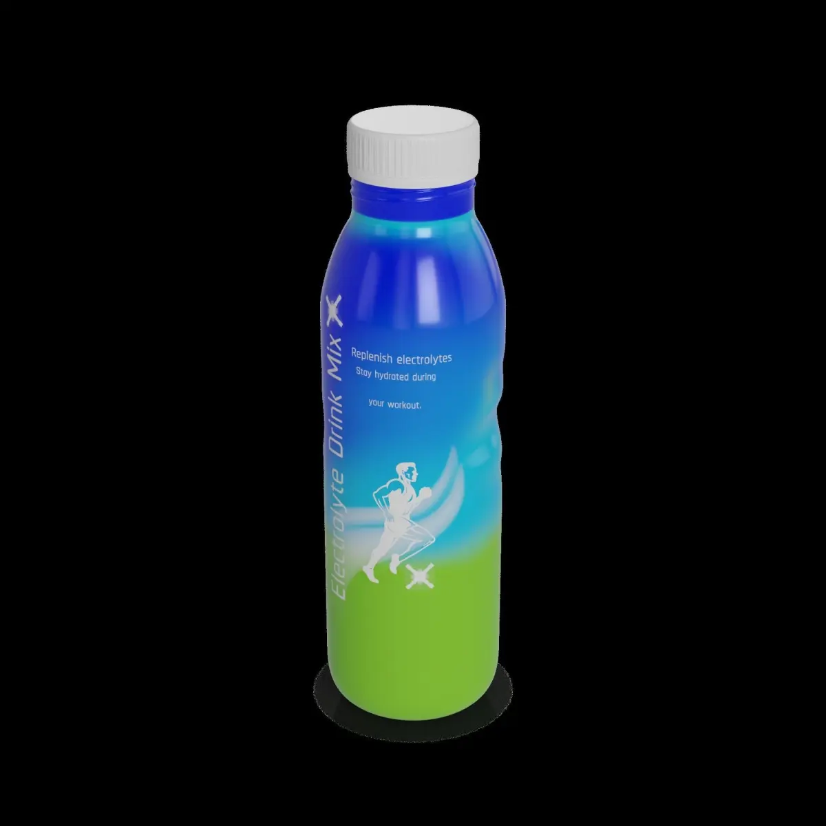 Electrolyte Drink Mix: A tall and slender plastic bottle filled with electrolyte drink mix. The bottle has a gradient design, transitioning from a vibrant blue at the top to a refreshing green at the bottom. The label prominently displays the product name and a graphic of a person engaged in a sport. Additional text labels include Replenish electrolytes and Stay hydrated during your workout.