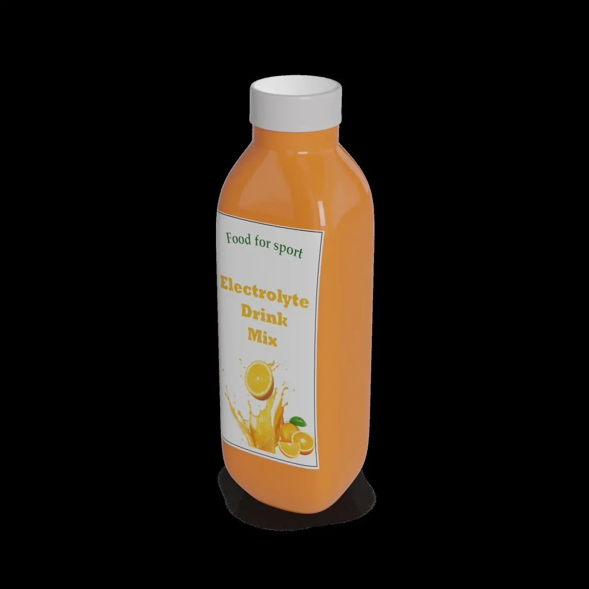 Electrolyte Drink Mix: This electrolyte drink mix comes in a tall, slender plastic container. The container is transparent, allowing you to see the vibrant orange powder inside. The label on the container provides detailed instructions for mixing the drink, along with a graphic of a person engaged in physical activity. The powder is easily dissolved in water and provides a refreshing citrus flavor. Available in a 500g size.