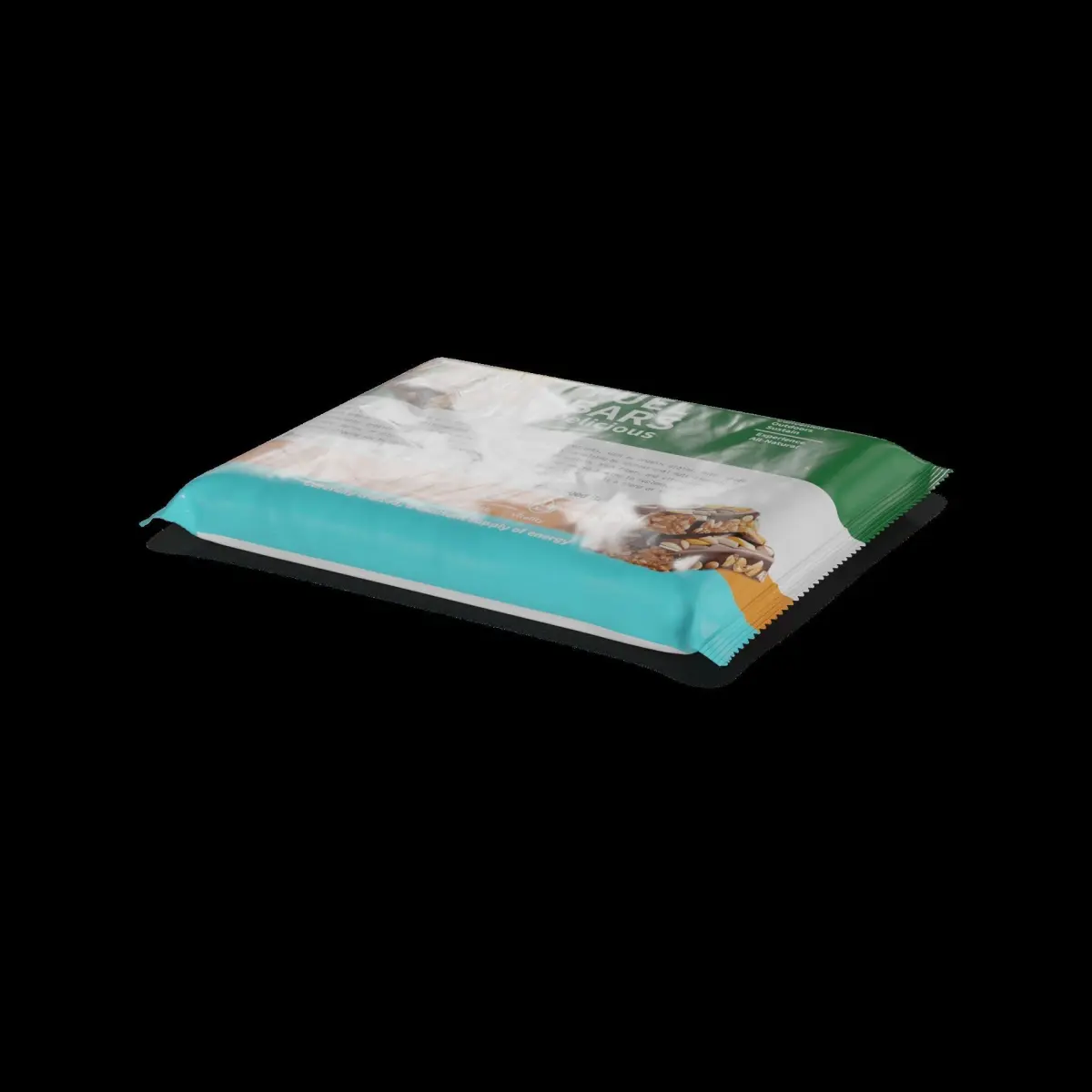 Energy Bars: A box of energy bars, neatly arranged in a colorful packaging. The box features a mix of vibrant colors, including green, orange, and yellow, giving it an energetic and sporty look. The front of the box showcases the brand name and a graphic of an active individual. The back of the box includes nutritional information, such as calories, protein, and carbohydrates, along with a label that says Fuel your workout with our energy bars!