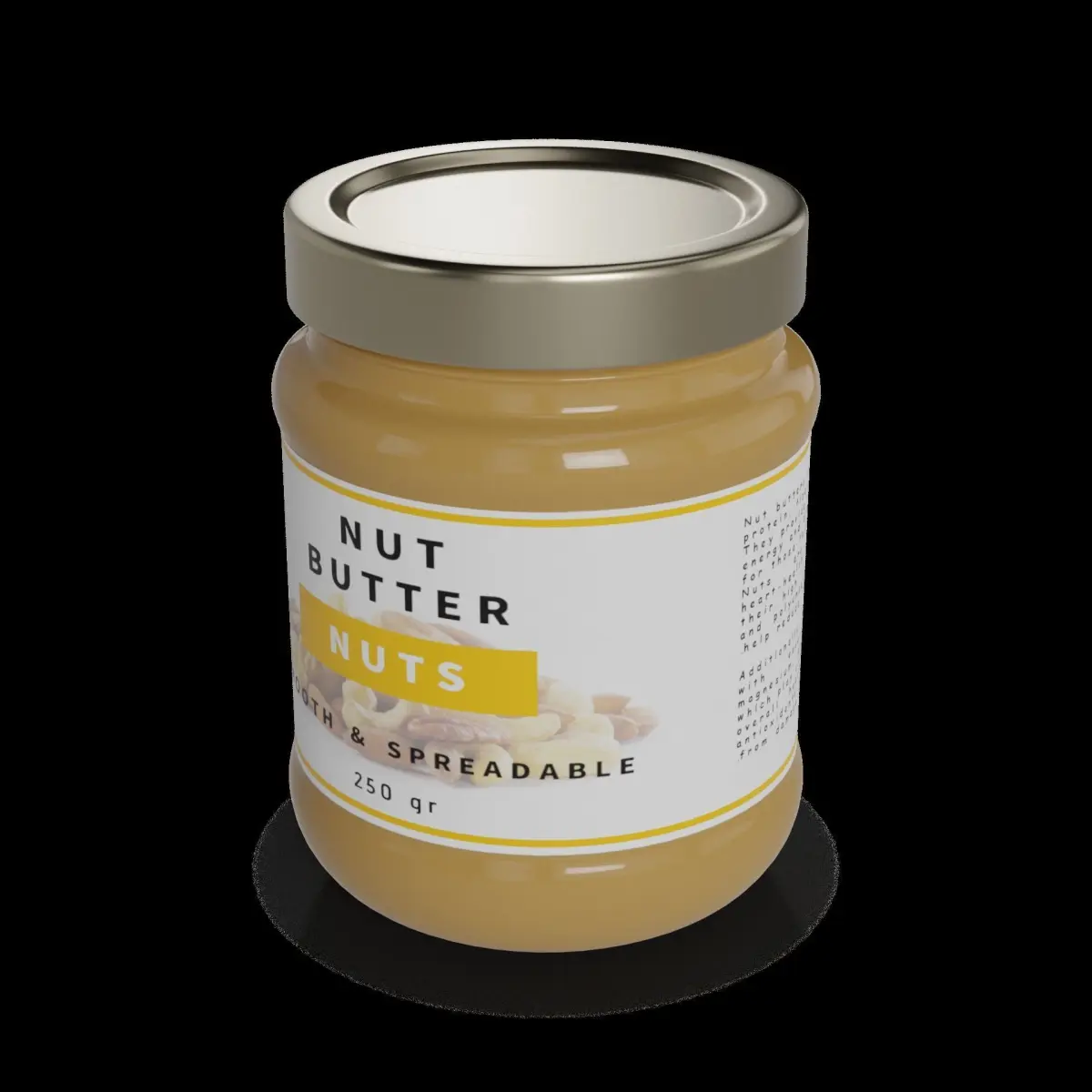 Nut Butter: This nut butter comes in a glass jar with a metal screw-on lid. The jar is transparent, allowing you to see the creamy texture of the nut butter inside. The label on the jar features the brand name and a graphic of a handful of nuts. The nut butter is smooth and spreadable, perfect for adding a boost of protein and flavor to your meals or snacks. Available in a 250g size.
